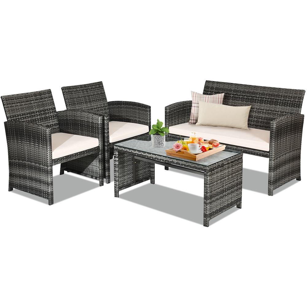 Elevate your outdoor living space with the Costway 4 Seater Rattan Bistro Set Grey. This set includes a loveseat, two armchairs, and a coffee table, all designed to create a perfect setting for relaxing and entertaining. Crafted with weather-resistant wicker and a robust metal frame, this set promises durability and stability, allowing you to enjoy its comfort through various seasons. The plush cushions offer an upgraded sitting experience, while the ergonomic backrests and curved armrests enhance comfort. The coffee table, topped with heat-resistant tempered glass, adds convenience and style, making it easy to access drinks and snacks. Whether placed on your patio, deck, or garden, this furniture set transforms any outdoor area into a cosy retreat.