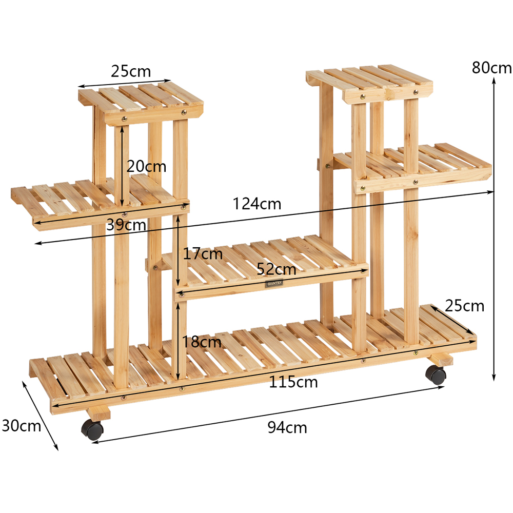 Showcase your greenery with the Costway 8 Shelf Plant Stand, featuring eight shelves at four different heights to accommodate a variety of plants and decorations. Made from high-quality fir wood, this stable stand supports up to 10 kg per level, ensuring durability. With four flexible wheels for easy mobility, this versatile piece is suitable for both indoor and outdoor use, allowing you to position your plants wherever you need them.