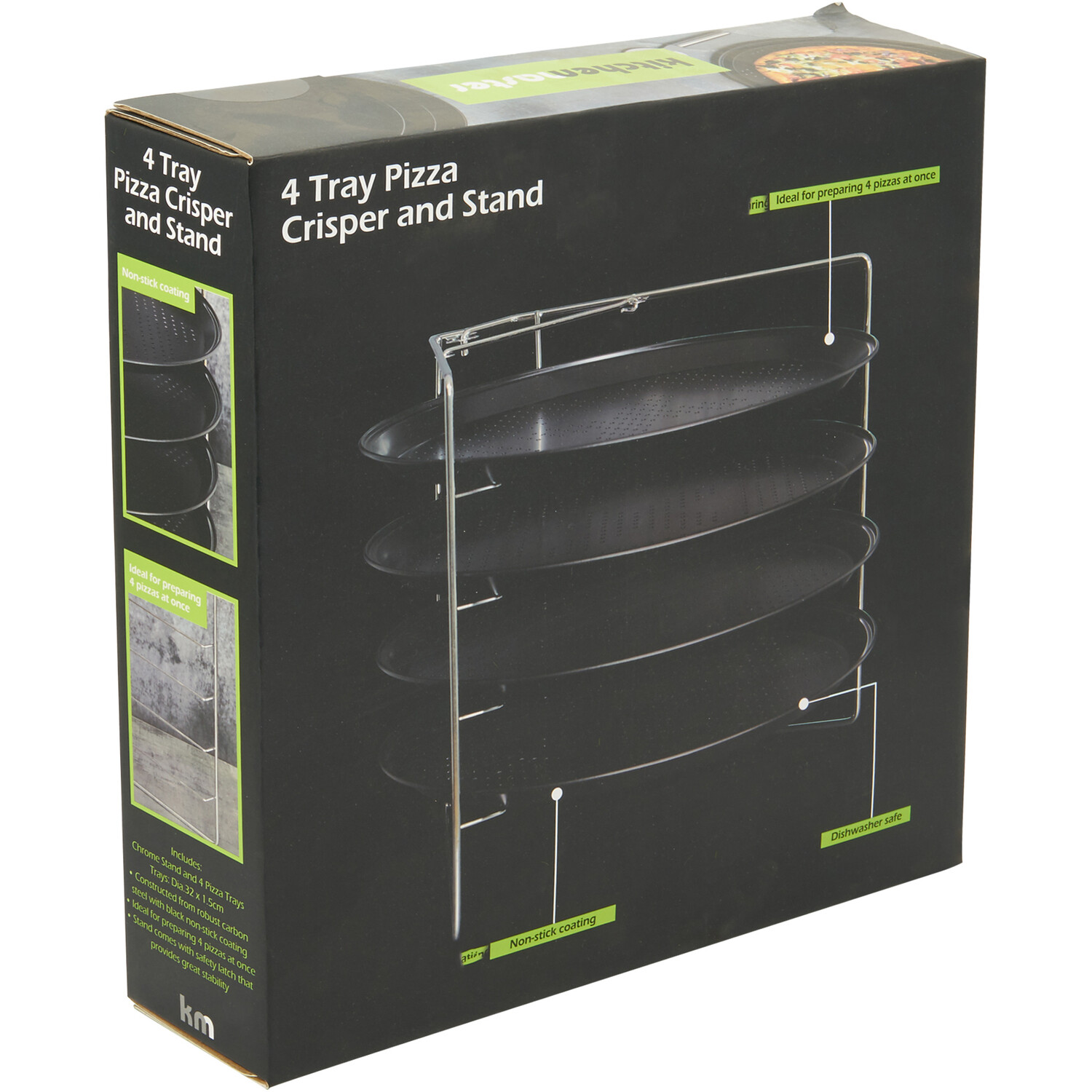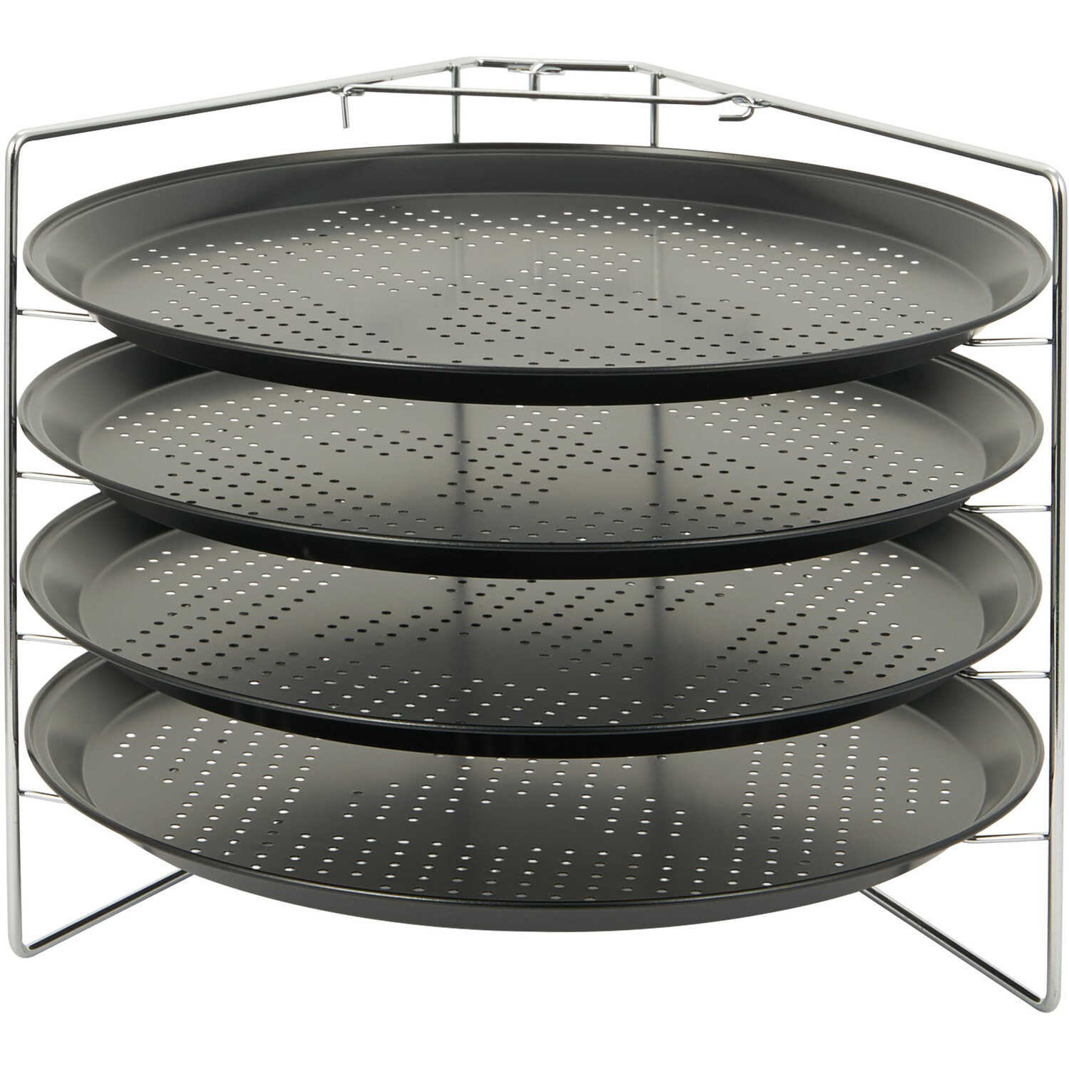 The 4 Tray Pizza Crisper and Stand is the perfect kitchen accessory for parties and events, or people who just really like pizza! It's ideal for preparing four pizzas at once and each pan delivers even heat for the perfect pizza every time. It's made from carbon steel with a non-stick coating for convenient use and cleaning and the stand comes with a safety latch that provides great stability. All pans stack neatly inside each other for space saving storage.