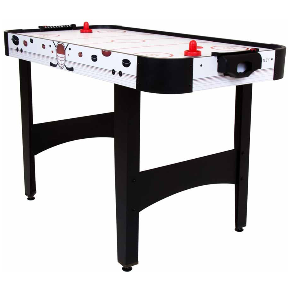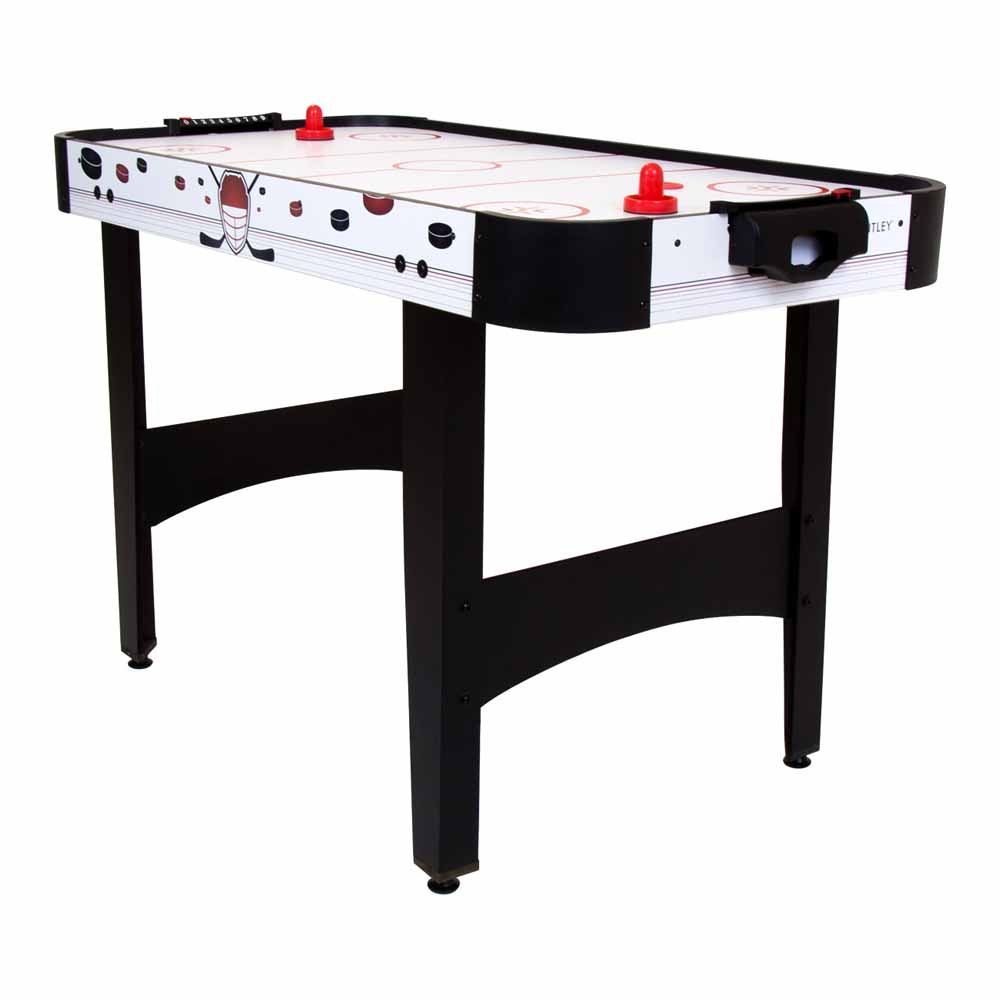 Have hours of fun with the air hockey table! This popular game replicates an ice hockey pitch where players use pushers to strike a floating puck. The aim is to use the angles of the table to direct the pucks into the opponent's goal. The floating effect is created by a powerful fan blowing air through small perforations in the play surface.