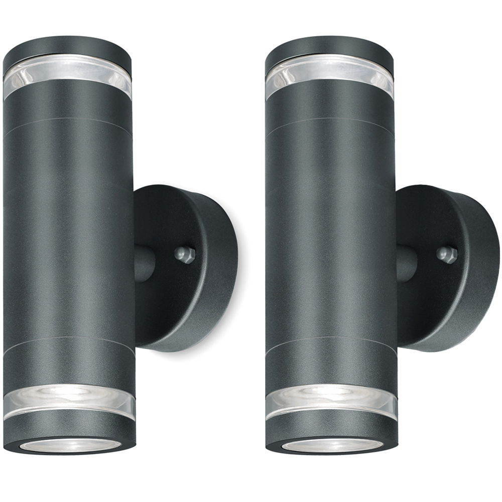 Transform your outdoor lighting with the 4lite Marinus 2 Pack Bi-Directional Anthracite Wall Light. Compatible with smart GU10 bulbs, it can be controlled via the WiZ app, allowing you to choose from over 16 million colours, temperature and brightness adjustments. Crafted from corrosion-proof marine-grade stainless steel, it is built to withstand harsh elements. It's salt spray tested for 96 hours, making it ideal for coasts too. The IP44 compliance ensures durability. The glass halo edging adds an atmospheric lighting effect, enhancing its glow. Specifications: Input: 220-240V. Wattage: 14W. Dimensions: 92x92x185mm.