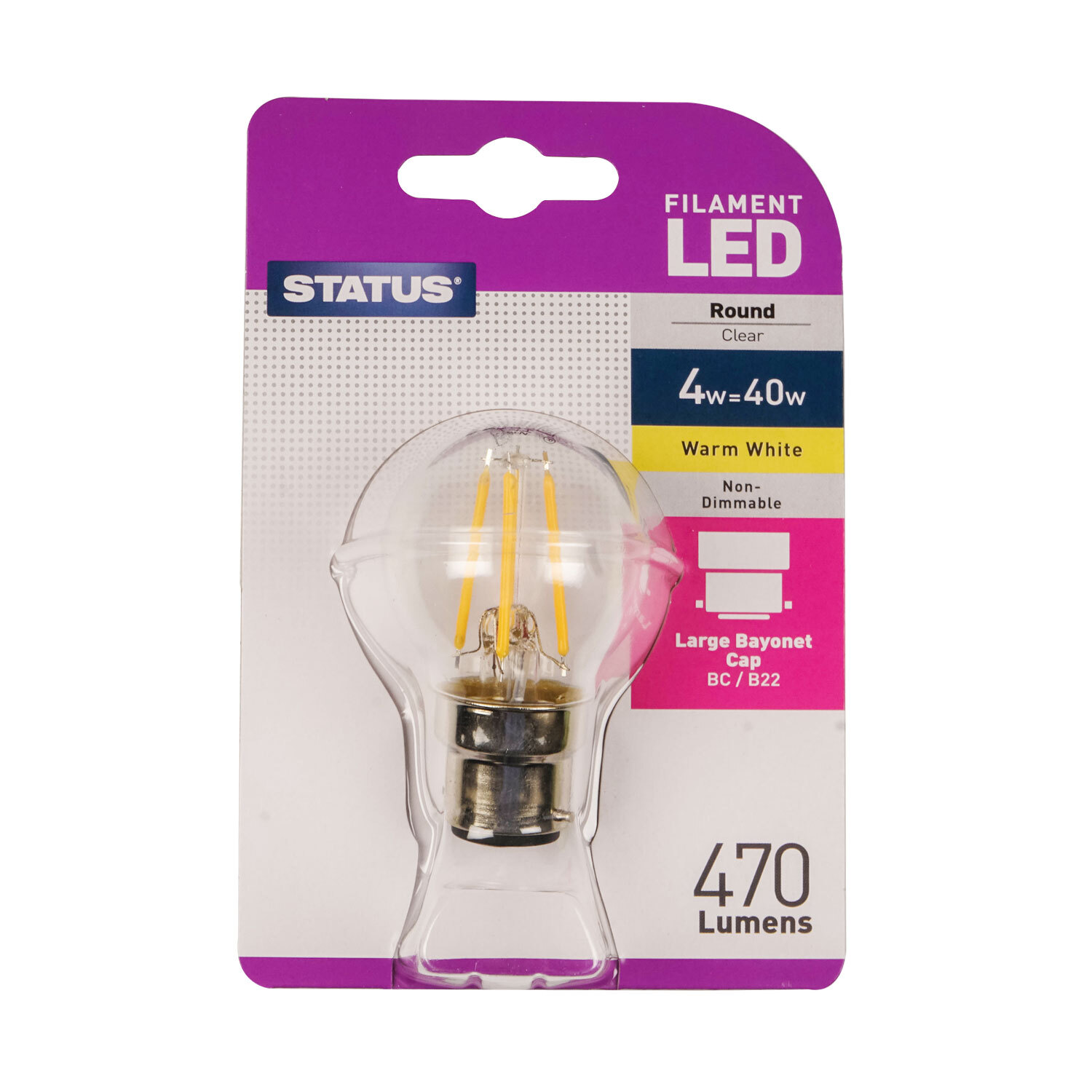 Made with an LED filament, this 4W 40W Filament LED Round BC Bulb is an ideal choice for any modern home. It has a bayonet cap fitting and is round in shape.