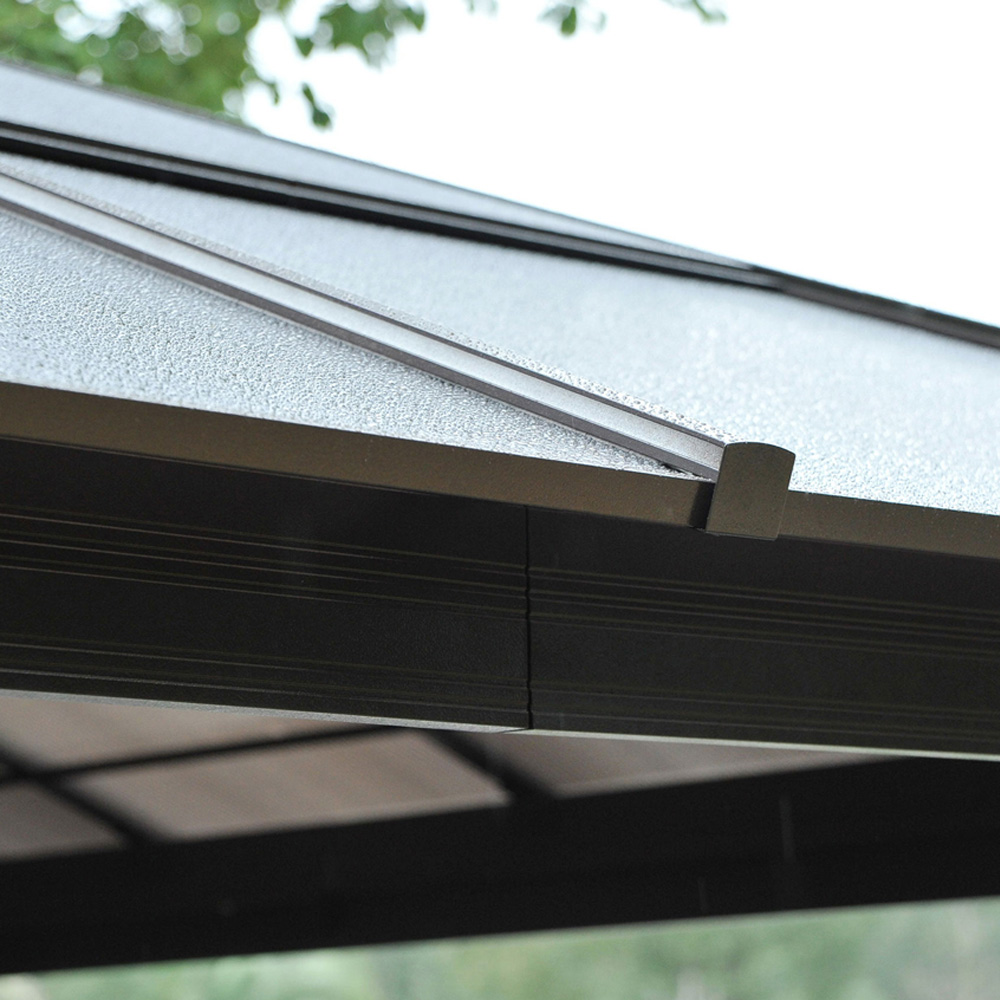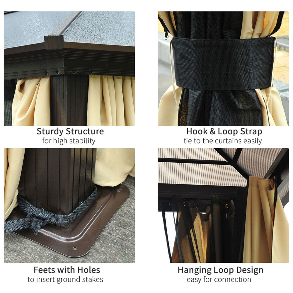 Create the perfect spot to hold your outdoor gatherings with this 4 x 3.6m Black Gazebo with Hardtop from Outsunny. Made from polycarbonate in an angled design with a sleek finish, the hardtop roof protects you from water and harmful sunrays. Finished with four large curtains, each with a mesh screen, it offers privacy when required and keeps bugs and insects out at the same time. Apart from this, it includes ground stakes for extra security and stability. Size: 4 x 3.6m.