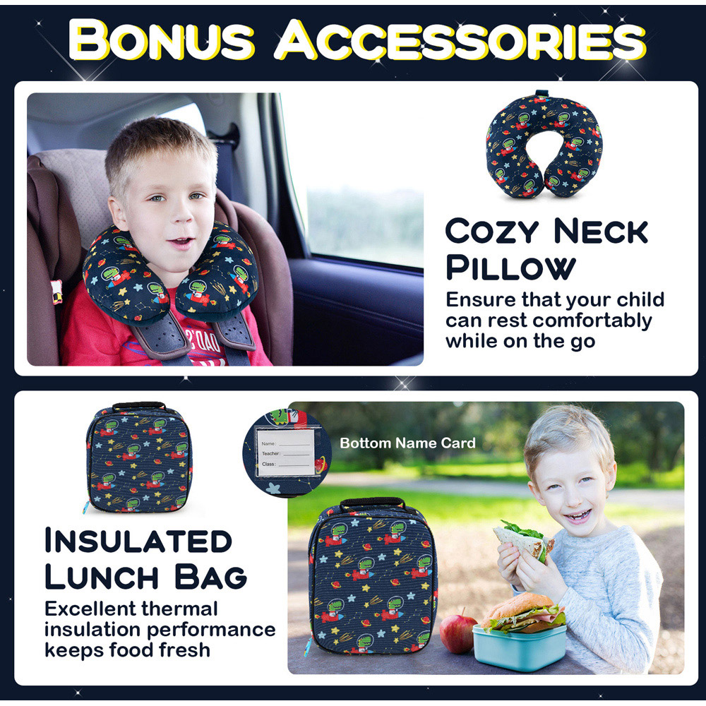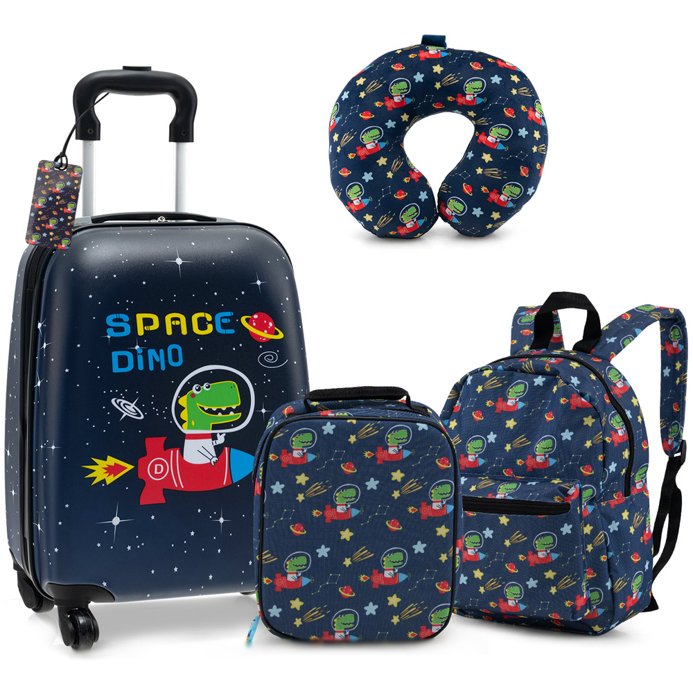 - Includes a rolling suitcase, backpack, lunch bag and neck pillow