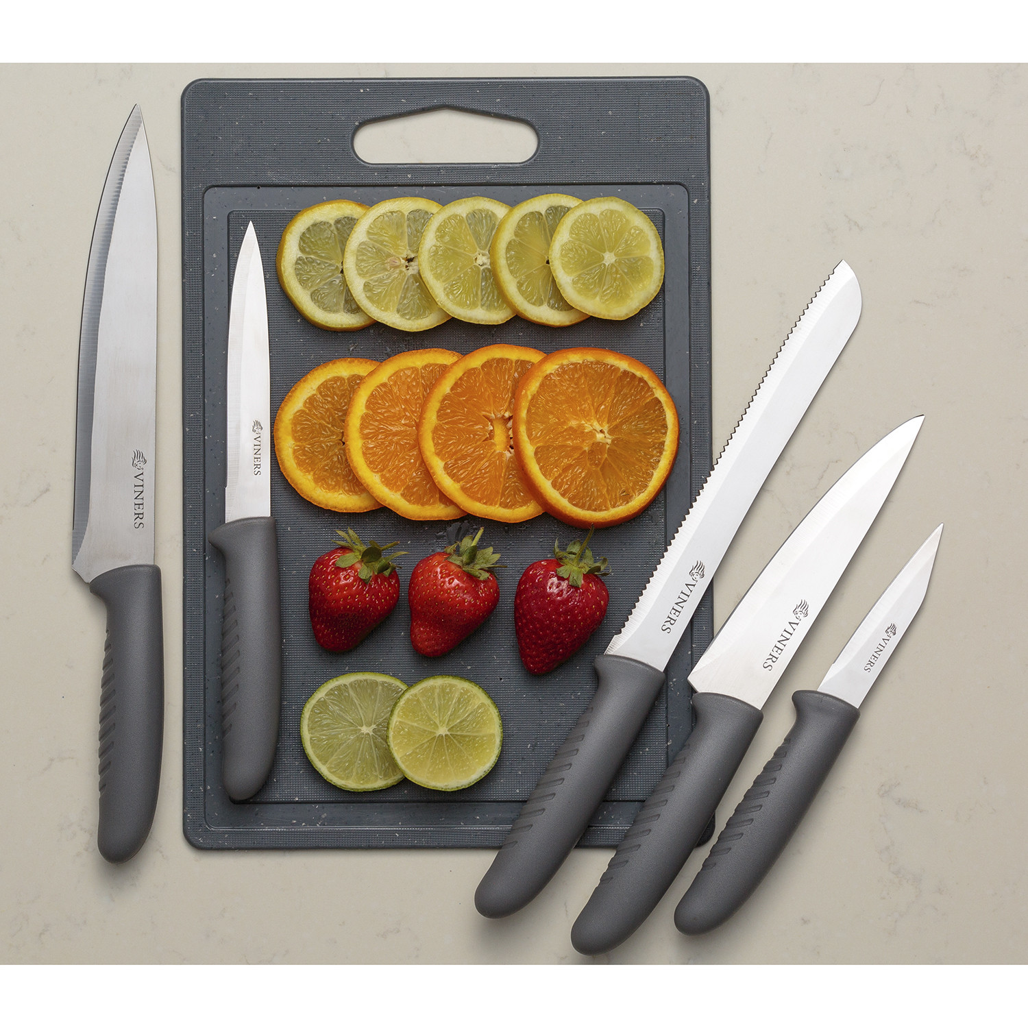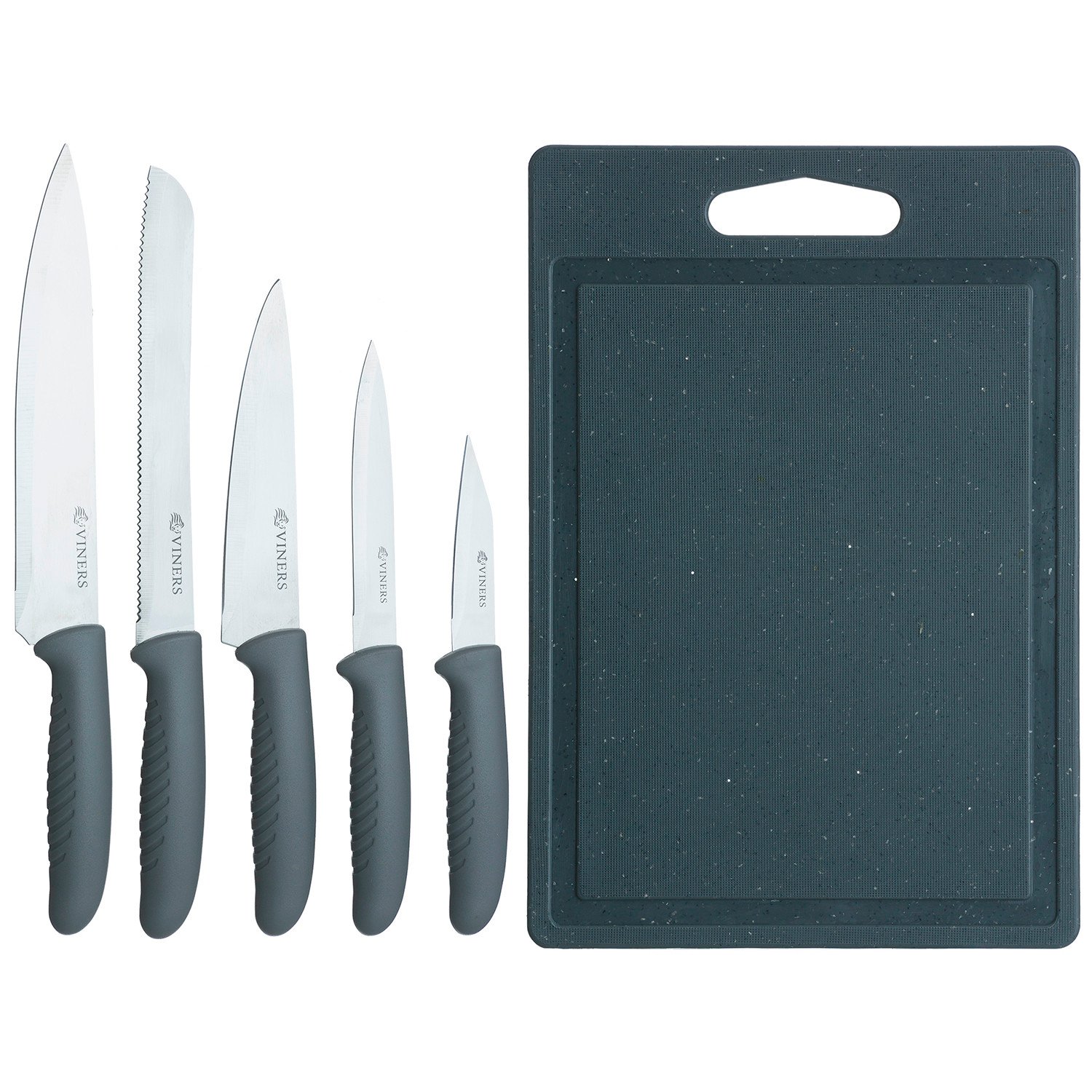 The 5 Piece Speckle Knife Set and Chopping Board will proved a selection of knives for all your cutting needs, including a chef's knife, carving knife, bread knife and more, as well as a matching chopping board, so you can prepare and cook your meals in style. The soft-grip handles provide extra comfort, while the dark, speckled design across them and the chopping board will bring a sense of professionalism to your kitchen.