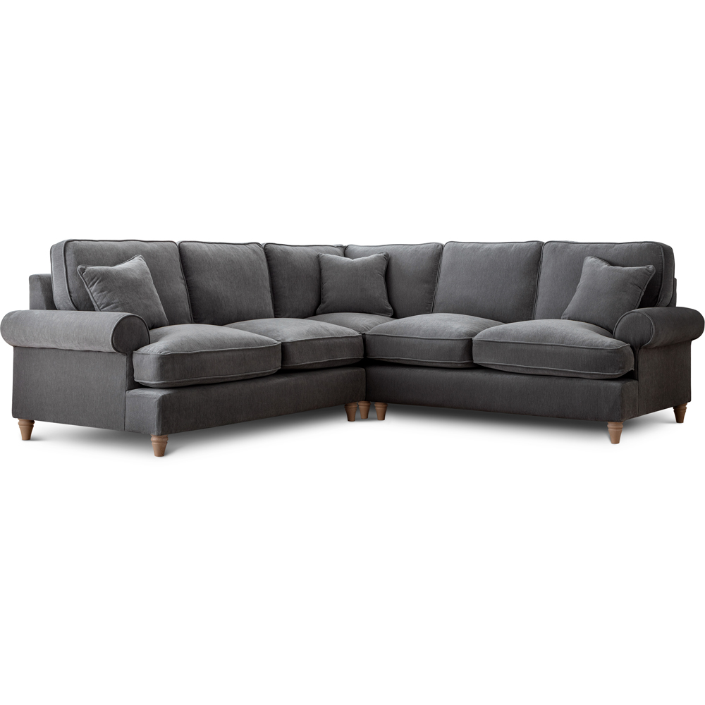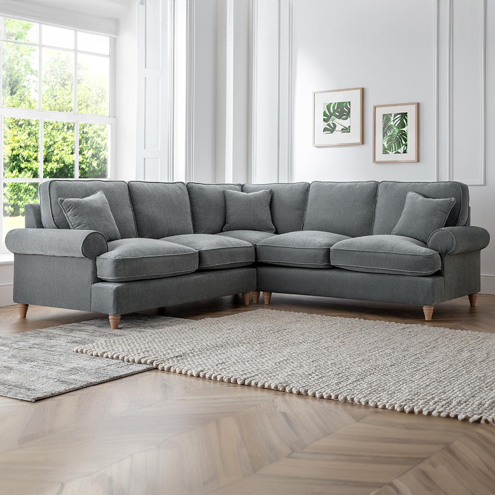Go for a comfortable retreat with the The Victoria 5 Seater Charcoal Corner Sofa. This handcrafted piece exudes timeless elegance and sophistication with its classic design and luxurious appearance. Its scroll arms and extra deep seat cushions exude opulence, making it a stunning addition to any space. The soft-touch fabric is not only luxurious but also easy to professionally clean. It effortlessly combines timeless style with contemporary appeal and comes with scatter cushions for extra comfort. Its back cushions, filled with soft-fill polyester fibre, require regular plumping to maintain their shape and comfort. The deep pocket sprung seat cushions ensure optimal comfort and support. Topped off with modern pale wood legs, this is a true statement piece. Additionally, it can be professionally cleaned and will be delivered to your room of choice, with the packaging removed for your convenience.