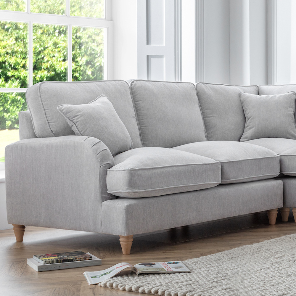 Sink into comfort with the The Vienna 5 Seater Ice Corner Sofa, a timeless classic sofa reimagined for the modern and style-conscious home, featuring the luxurious and soft Manhattan fabric with a textured feel. This stunning sofa comes in a vibrant hue to effortlessly complement any interior design scheme. The back cushions are generously filled with polyester fibre and should be regularly plumped by hand to uphold their shape and comfort. All covers are removable and can be professionally cleaned. Handcrafted with tailored pleat arms and modern pale wood legs, this sofa boasts deep-seat pocket sprung interior seat cushions enveloped in high-density foam for extra plushness. For added convenience, the sofa will be delivered to the room of your choice with the packaging removed.