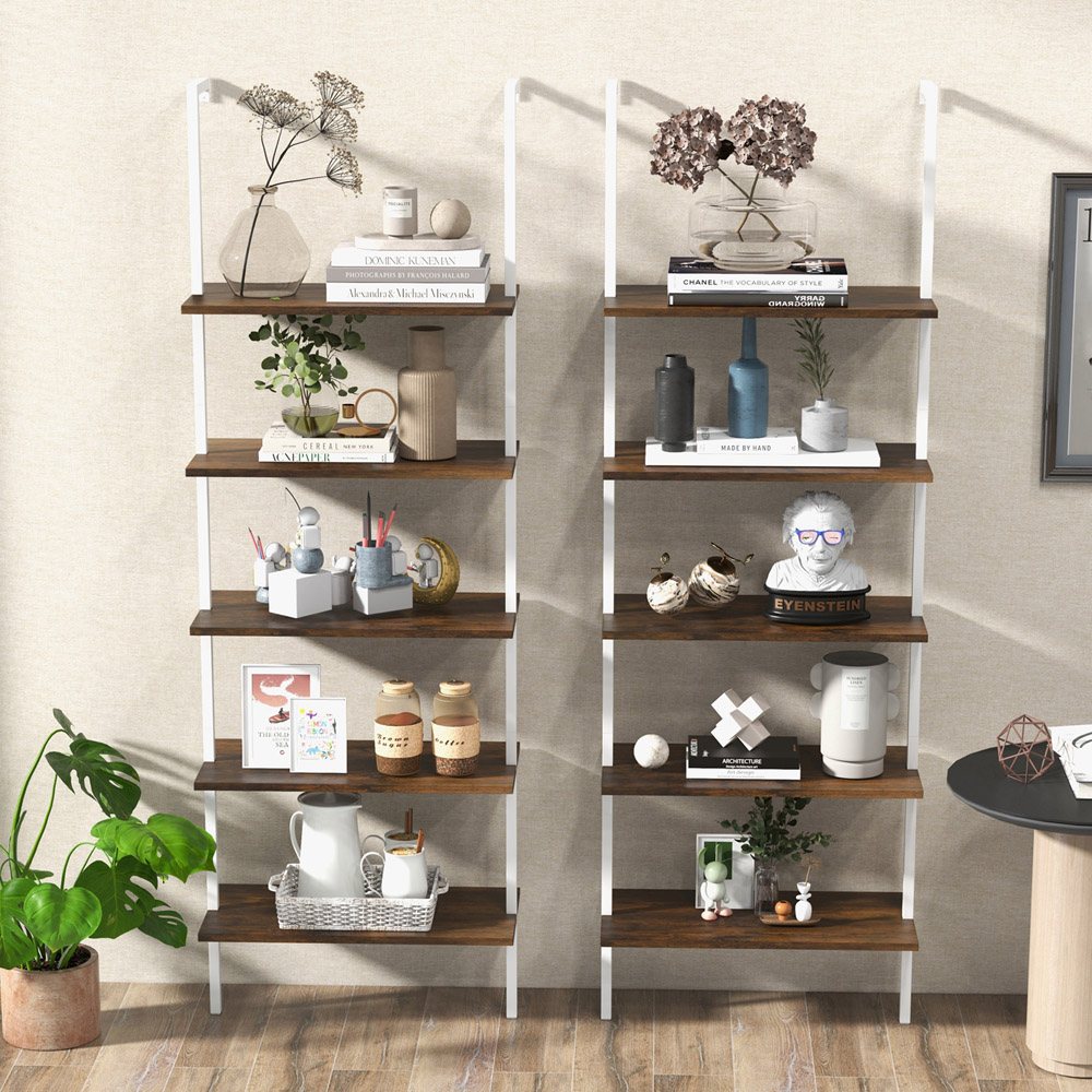 Elevate your space with the Costway 5 Shelf Steel Frame Natural Ladder Shelf Unit. It is a stylish and functional piece that is designed to meet all your storage needs. It seamlessly blends into any living room, bedroom, or office setting. Featuring a robust sprayed steel frame, this ladder shelf ensures strong load capacity and stability, thanks to the included wall-mounted kit that prevents tipping or wobbling. The anti-slip pads protect your floors while the five wide shelves provide ample storage space for books, decorations, plants, and tableware. Its classic design not only adds a touch of elegance but also meets various storage needs, making it an essential addition to your home. Plus, the simple assembly process ensures you can enjoy this stylish storage solution without any hassle.