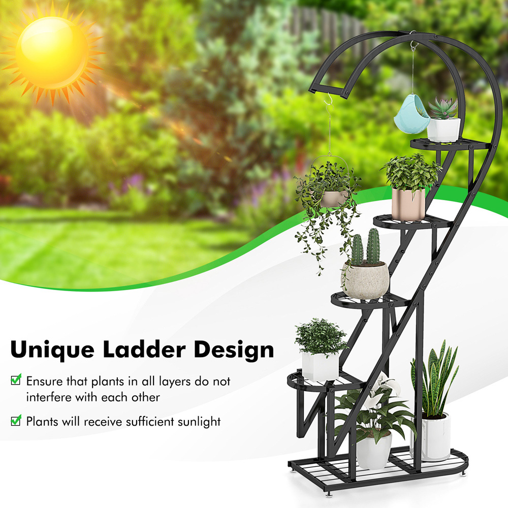 Elevate your plant display with the Costway Black Metal Plant Stand with Hanging Hooks. This five-tier metal stand is water-resistant and perfect for both indoor and outdoor use. The slatted shelves ensure excess water drains away, extending the stand’s lifespan. Each tier is 25cm high, so you can fit both small and large pots, giving you plenty of room to showcase your plants. It also works as a storage rack for baskets and decorations, plus it has four hanging hooks for extra functionality. You’ll get two matching stands that can be arranged into a heart shape, making it a charming addition to your home, balcony, or porch. And with eight adjustable foot pads, it stays steady even on uneven surfaces.