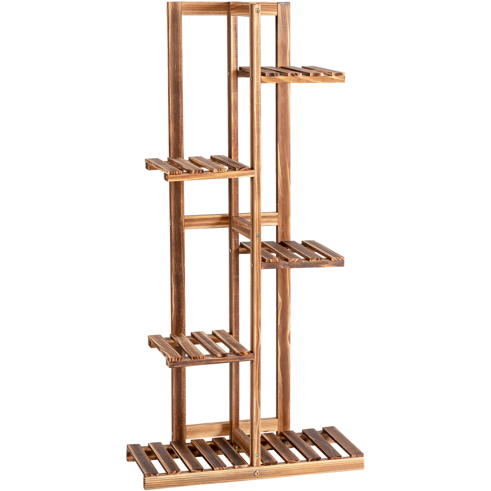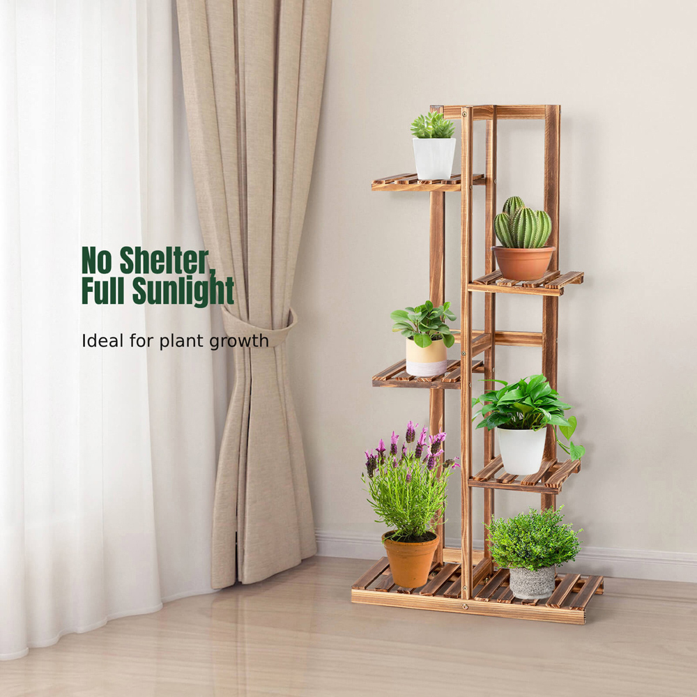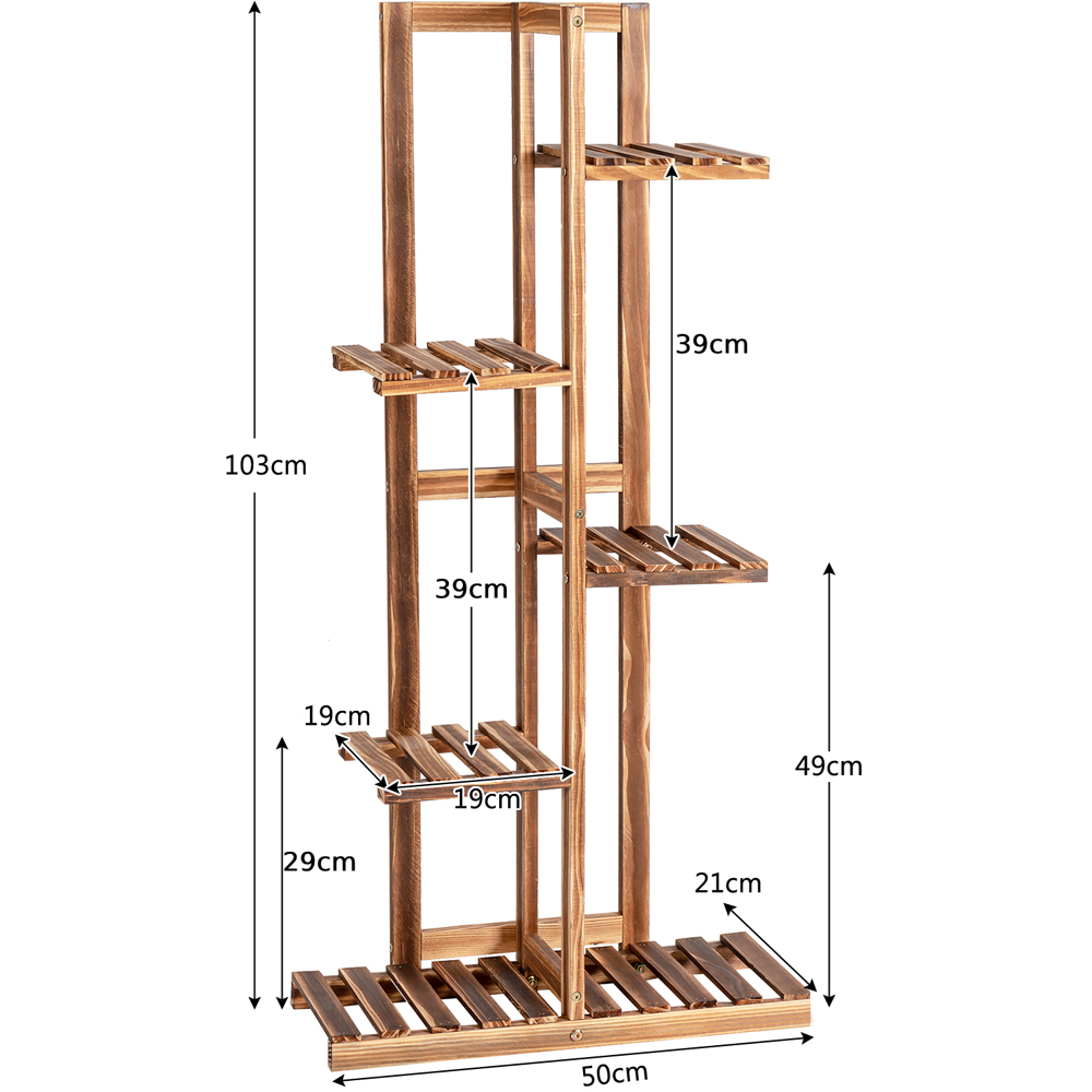 Elevate your greenery with the Costway 5 Tier Wooden Freestanding Plant Stand. It is a charming addition to any home or garden that beautifully displays up to six of your favourite plants. Crafted from 100% premium pine wood and designed to withstand various weather conditions, this freestanding display shelf is not only robust but also maintains its aesthetic appeal over time. The vertical and staggered design allows for optimal sunlight and nutrient absorption for each plant, while the compact structure fits seamlessly into any corner or limited space. Whether used as a plant stand, bookshelf, or decorative rack, this versatile piece is sure to enhance your décor.