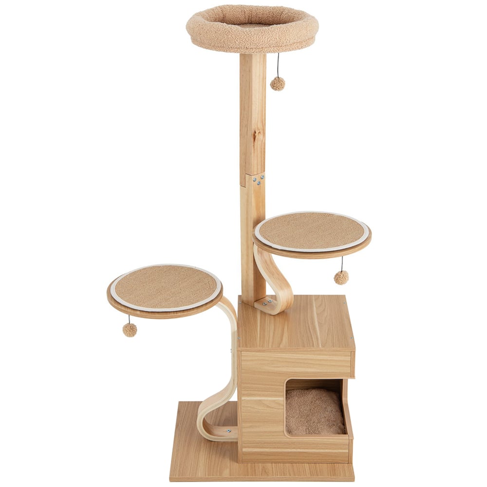 Elevate your feline's fun and comfort with the Costway Natural Wooden Cat Tree with Solid Wood Post 130cm. It is designed to satisfy their natural instincts and provide a luxurious resting space. This cat tree stands at 129 cm, featuring four levels of entertainment and relaxation. The top perch offers a splendid view and a cosy spot for napping, while the private cat condo at the base allows for peaceful lounging. With two additional platforms for adventurous jumping and three dangling balls for endless play, this cat tree is a complete activity centre. Crafted with a solid oak wood post and curved plywood frame, it ensures a stable and durable environment for your cat to climb and explore. The inclusion of mohair plush cushions adds a touch of warmth and comfort, making it the perfect retreat for your furry friend.