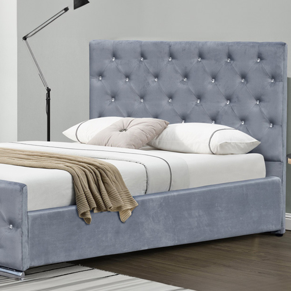 King Size Grey Fabric Diamante Chesterfield Ottoman Bed