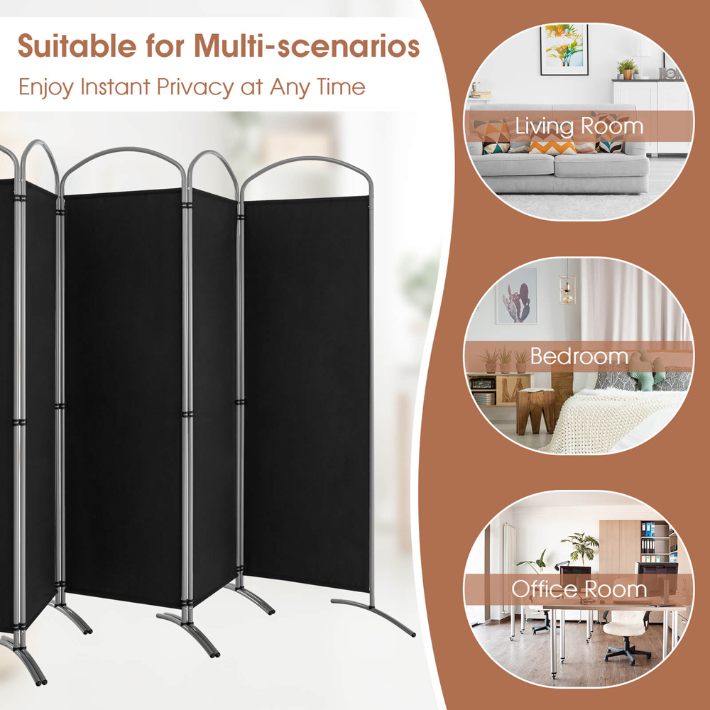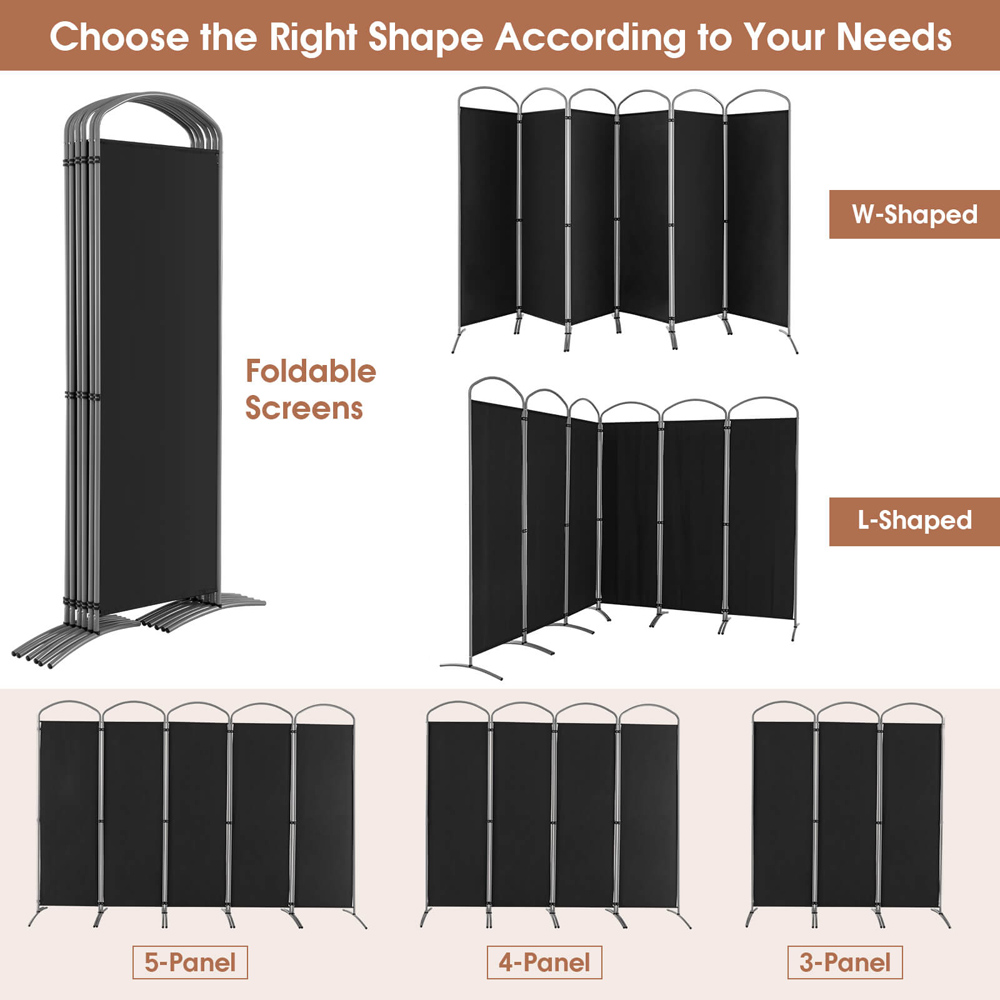 Transform your space with ease using the versatile Costway 6 Panel Black Freestanding Fabric Room Divider, perfect for both home and office settings. This room divider not only offers the privacy you need but also serves as a stylish backdrop for online meetings. Constructed with a robust metal frame and a stable base, it ensures durability and rust resistance thanks to the powder coating process. The high-quality woven fibre panels are wear-resistant and promote air circulation, making this divider both functional and breathable. Its flexible design allows each panel to be used individually or linked together with connecting clasps, providing various configuration options like L-shape, W-shape, or C-shape to suit your needs. Easy to assemble and equally simple to store, this room divider is an ideal solution for creating temporary private spaces or blocking sunlight next to windows. It measures 188cm in height and 331cm in length for ample coverage.