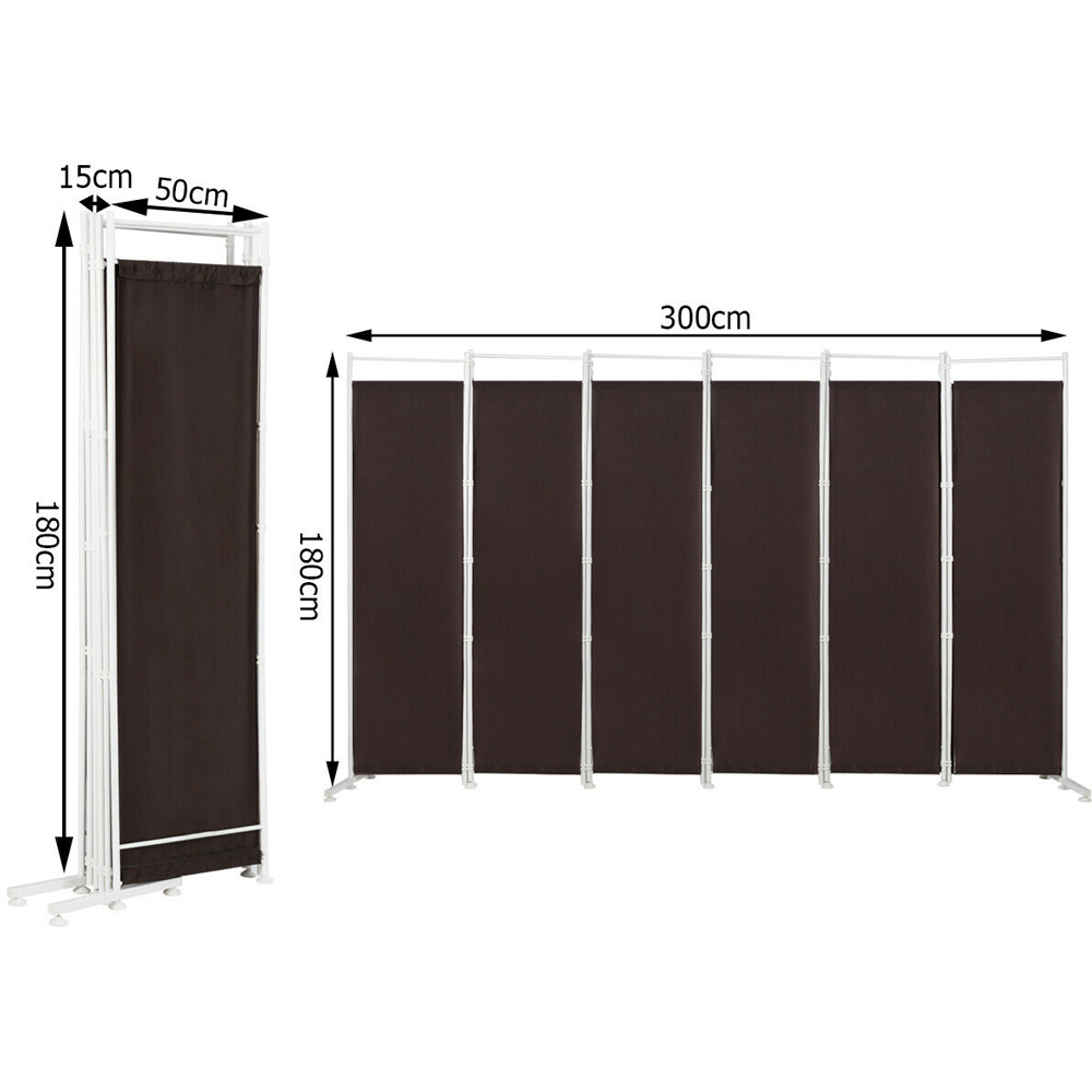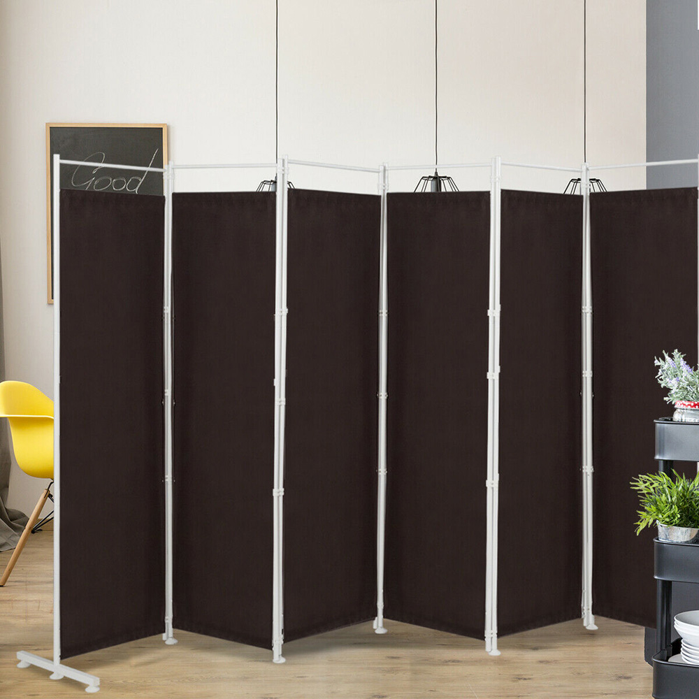 Create instant structure in any room with the Costway 6 Panel Coffee Room Divider with Adjustable Foot Pads. It is tall enough to create a private space for you. Unlike regular walls, it has an open top for air circulation. This design helps you feel more relaxed while still providing privacy. The panels are crafted from premium, durable and waterproof polyester fabric. Plus, the sturdy and solid steel frame ensures it lasts for a long time. The divider comes with adjustable foot pads and two support tubes at the bottom for added stability, preventing it from tipping over. With 25 plastic buckles, it can quickly be adjusted in either direction. When not in use, it folds easily for storage. Its lightweight design allows you to move it to different places as per your requirements. This six-panel protective partition can also be separated into smaller pieces to suit your needs. You can place it by a window to block out bright sunlight or use it as a door in a small space. It is perfect for creating temporary privacy for overnight guests as well. Plus, detailed instructions make it easy to assemble the folding divider in just a few minutes. Moreover, the waterproof surface allows for simple cleaning with a damp cloth.