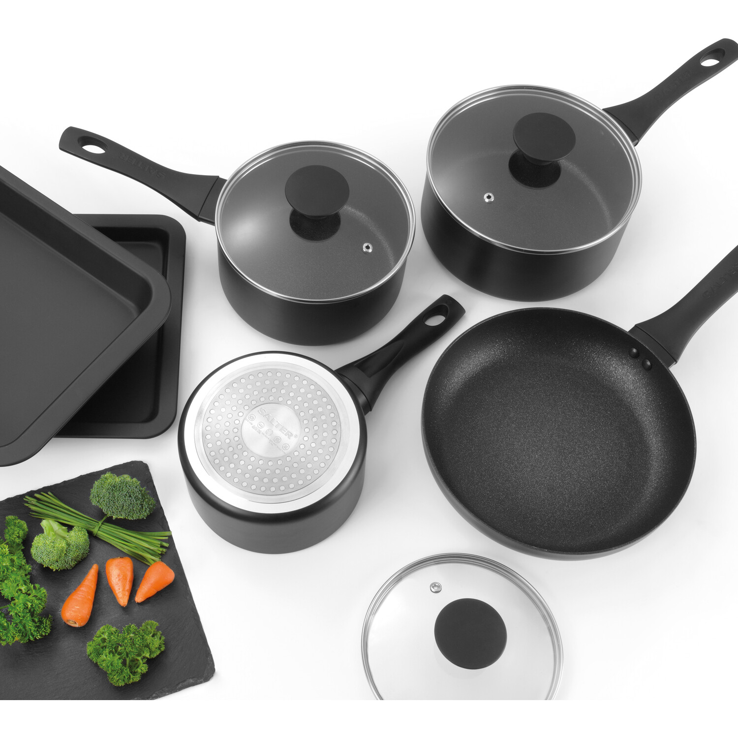 The 6-Piece Salter Frying Pan and Tray Set is the perfect collection for your kitchen. The set includes kitchen must-haves: a frying pan, three saucepans with lids, and two baking trays! Each piece in the set offers ultra non-stick cooking performance and are abrasion resistant. Whether you're cooking for everyday meals or special occasions, this set is the perfect choice. They're safe for use with metal utensils as they're scratch and corrosion-resistant to keep them looking their best after every use. The pans are suitable for all hob types and are finished with comfortable, soft-touch handles and comes with tempered glass lids with a steam vent. Every utensil included is long-lasting and will be a practical and stylish addition to your kitchen.