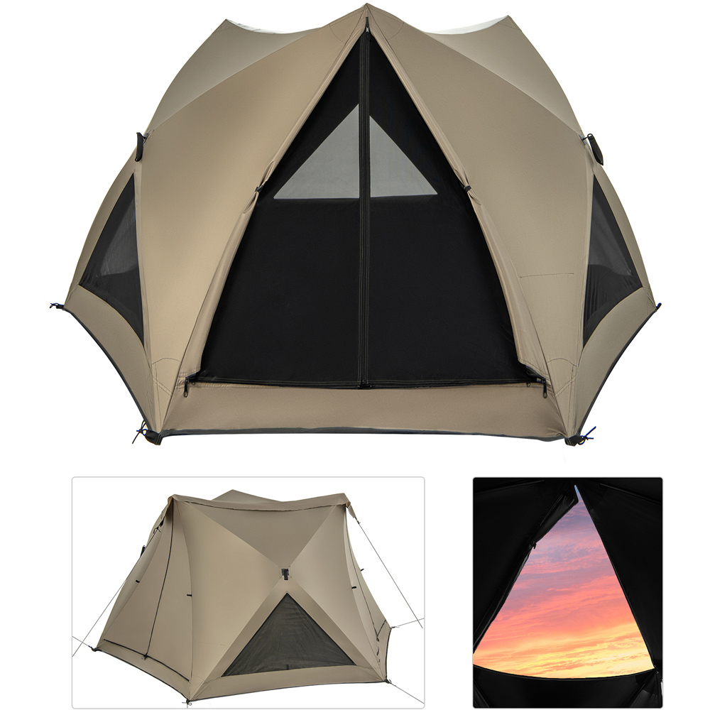 This instant pop-up camping tent measures 285 x 250 x 147 cm (L x W x H), providing ample space for 4-6 people. It can be an ideal choice for various outdoor activities, such as camping, picnics, barbecues, trips, beach relaxation, and more. Particularly, this tent features a transparent skylight with a zippered cover, which could bring natural light and starlit views into your camping experience. The canopy and rainfly are crafted of PU-coated polyester fabric, which is built to withstand various weather conditions. And the bottom is crafted of PE tarp, keeping the inside dry and comfy. Other than that, it is equipped with 12 ground stakes and 6 wind ropes, ensuring excellent stability and wind resistance. Additionally, there are 3 mesh screen doors for easy access, and 3 double-layer mesh screen windows for convection ventilation and privacy. Thanks to its pop-structure, you can easily set up or take down this tent in seconds by pulling or pushing rings. Also, it is designed with a portable carrying bag, thus you can take it anywhere you want. Weatherproof and Durable Material: The camping tent adopts a waterproof rainfly and canopy, which are made of premium 420D polyester fabric with PU coating, ensuring excellent sun and rain protection. Besides, it adopts a bottom PE tarp, offering reliable protection from water and the rugged terrain. (Note: Please avoid using it in heavy rain.) Skylight Design: The sun shelter comes with a transparent PVC skylight, allowing for exquisite stargazing and stunning view of nature from the comfort of your tent. And double-layer design allows you to adjust the skylight as needed. In addition, there is a detachable rainfly for added protection on rainy days. Pop-up Structure for Quick Setup: The instant camping tent comes with an upgraded pop-up structure, thus you can effortlessly install it in seconds. All you need to do is simply unfold the tent, pull 2 side rings, and secure the tent with ground stakes. Besides, it is also easy to take down by pushing all rings and then folding. Excellent Ventilation and 360° View: The outdoor sun shelter comes with 3 roll-up mesh screen windows and 3 large roll-up mesh screen doors, which could effectively promote air circulation while keeping “unexpected guests” away. And the door features double-sided zippers, providing easy access to get in and out. Stable and Sturdy Structure: The 4-season family tent is supported by high-strength fiberglass poles, ensuring excellent sturdiness and deformation resistance. Moreover, it boasts ring and stake fixations, wind rope and stake fixations, enhancing overall stability and security in windy conditions. Portable Design and Versatile Use: The family tent is designed with a portable carrying bag, making storage and transportation a breeze. It measures 285 x 250 x 147 cm (L x W x H), which could comfortably accommodate 3-4 sleeping bags. Whether it’s for camping, hiking, beach parties, outings, picnics, or trips, this portable sun shelter tent can be a perfect choice.