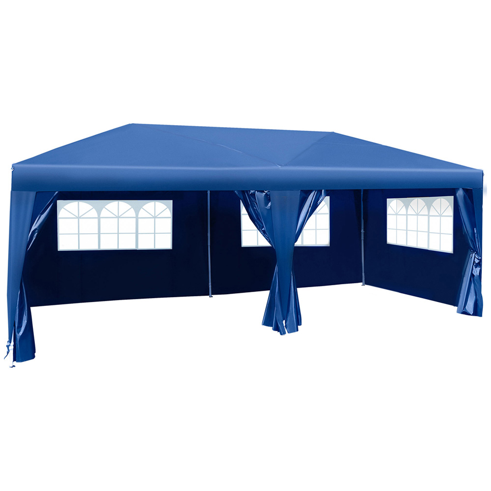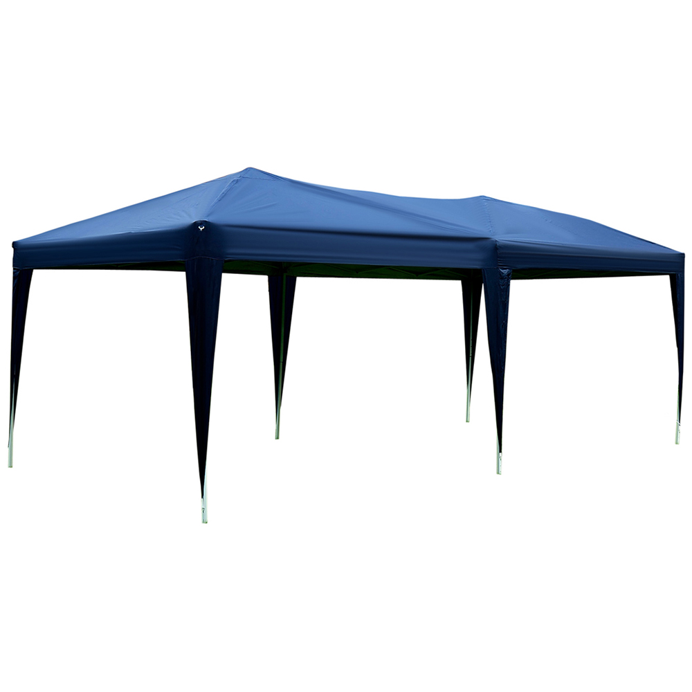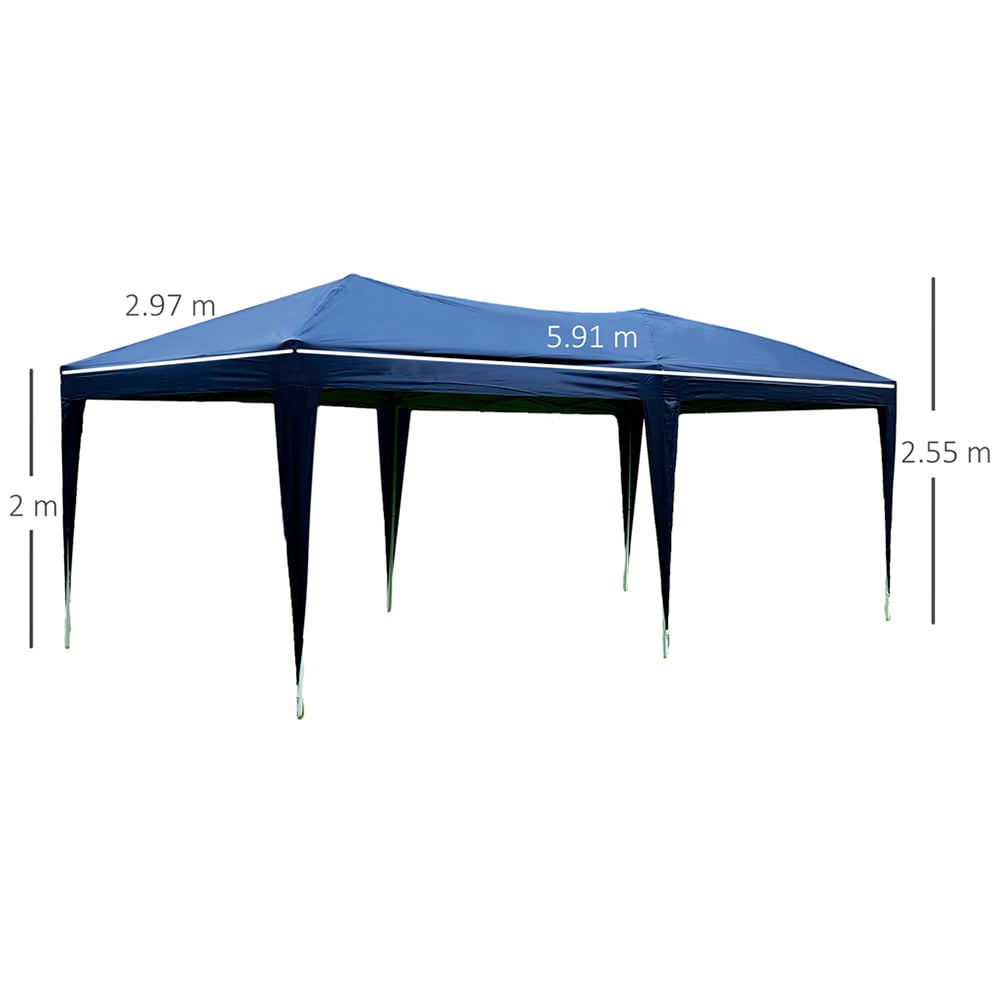 This Outsunny 6 x 3m Heavy Duty Pop-Up Gazebo in blue is a great, no-fuss outdoor shelter for family parties, weddings, picnics, sports events, outdoor vendors, craft fairs, job sites and camping trips. This garden shelter provides easy set-up and take-down in less than a minute. It also comes with a portable carrying case. This pop-up gazebo has a high-quality powder-coated steel frame which is rust-free and has high strength and is suited for winter. The canopy is made using durable water-resistant Oxford cloth which blocks light rain and most harmful rays to reduce heat. With six removable walls, it is easy to transport and assemble for various outdoor occasions. With a smart straight-leg design, it comes with ropes and stakes for added stability.