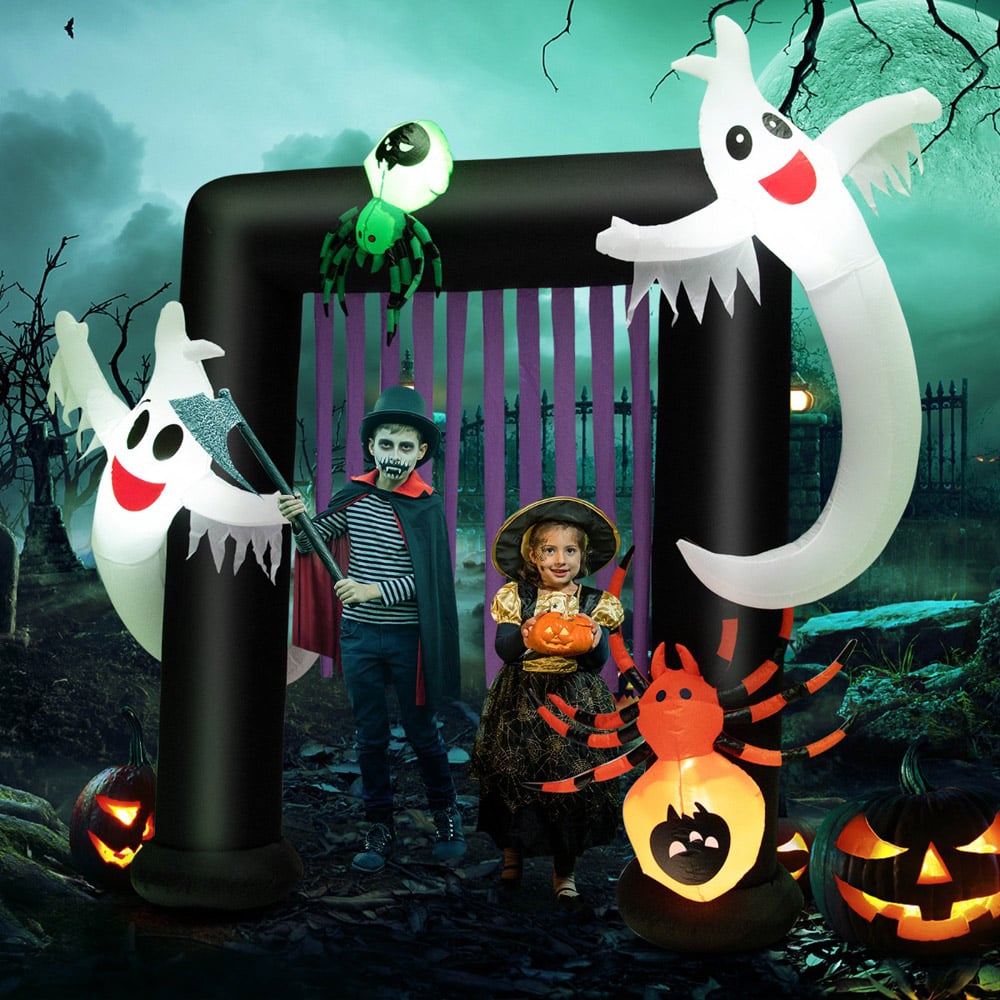 Enhance your Halloween spookiness with the Costway 2 Haunted Ghosts Archway Inflatable Halloween Decoration 8ft. This unique addition creates a spine-chilling atmosphere at parties and get-togethers. Featuring a life-sized archway with two scary ghosts and spiders, the inflatable decoration adds a whiff of terror to your decor, offering your guests the experience of Halloween magic. The decoration includes built-in LED lights that turn up automatically as you plug in to make the whole decoration apparent in the dark. It is an ideal decorative statue for Halloween parties, trick-or-treat activities, amusement parks and haunted houses. The powerful and waterproof air blower inflates the balloon decoration efficiently, presenting it in minutes. You can also deflate it effortlessly after plugging it off and unzipping the bottom zipper. It can be folded into small folds for storage. The inflatable decoration has multiple fixing accessories, making it suitable for indoor and outdoor. The three fixed sandbags at the bottom add weight to this standing decoration. You can also stabilize it using metal ground stakes and ropes to tie down the decoration and keep it in place. This inflatable decoration has its cover material carefully selected for excellent durability. It is crafted from vibrant coloured polyester fabric that is waterproof and weather-resistant, keeping it in good condition after extended use.