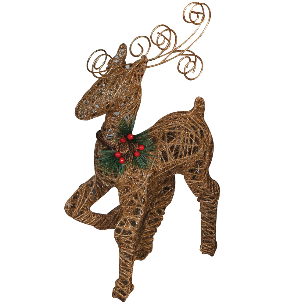 Brighten up any corner of your home with this beautiful LED Golden Rattan Reindeer. With a traditional Christmas floristry arrangement on the collar and shimmering golden details, this wonderful decoration can be used to decorate your home every winter.