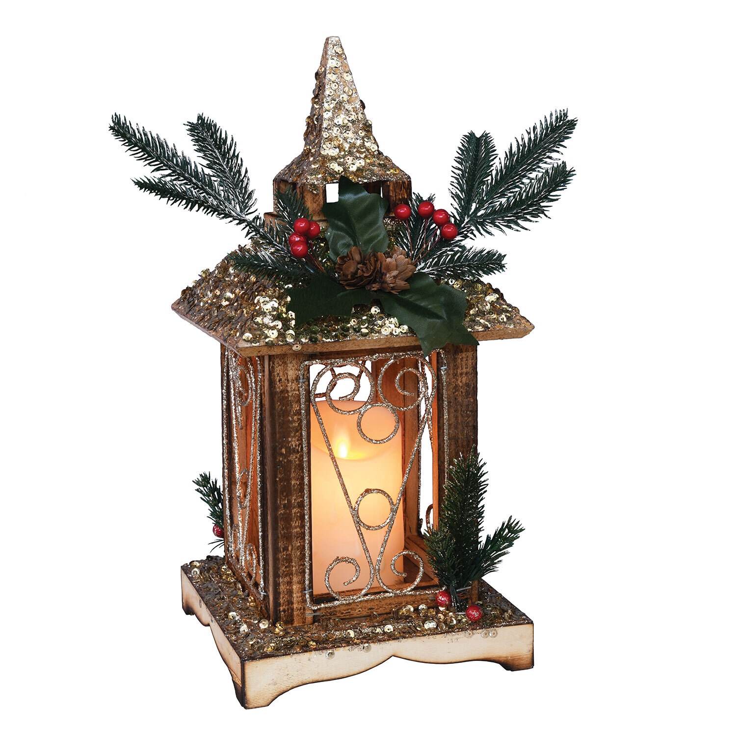 This beautiful LED Wooden Candle Lantern is a wonderful way to light up any windowsill, shelf, table or mantelpiece this Christmas. Featuring a variety of classically festive artificial greenery and sparkling glitter details, this lantern is sure to dazzle guests.