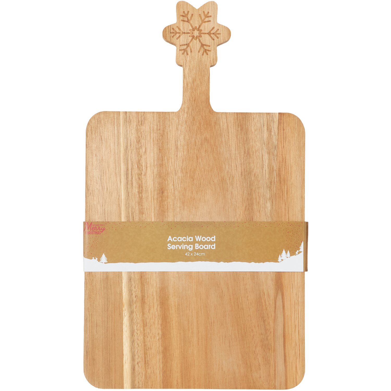 Bring charm to your Christmas dinner table with this Acacia Wood Christmas Serving Board. It is carved from real acacia wood, which holds natural anti-bacterial properties, making it a safe for serving your treats. The snowflake design creates an arty, interesting aesthetic which will bring character to your food presentation, while the natural wood grain throughout adds a real sense of natural beauty. Perfect for anyone who loves cooking food and presenting it in style, this serving board can also double up as a chopping board for food preparations.