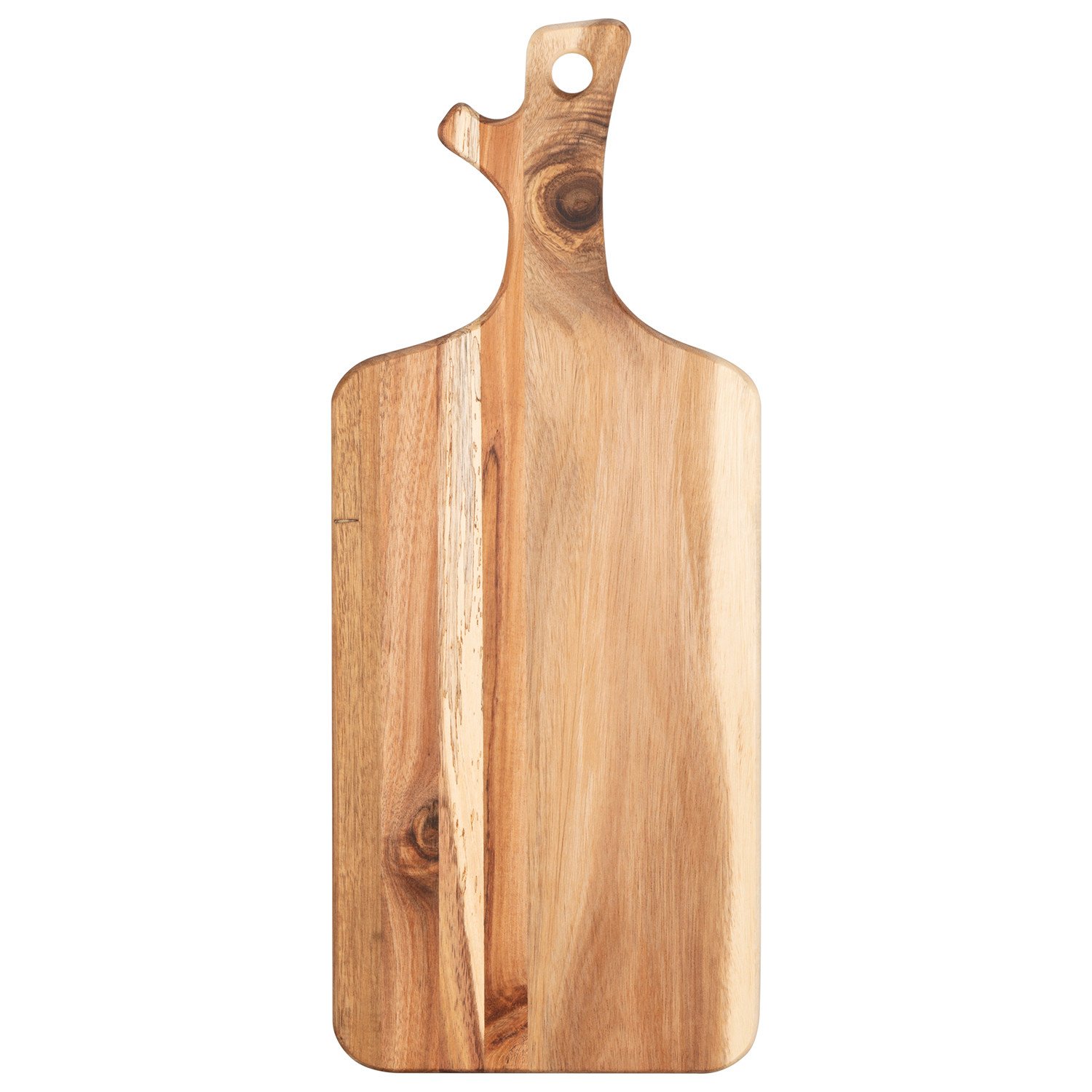 Perfect for creating a rustic, natural look in your kitchen, this Large Acacia Wood Handled Chopping Board features a decorative handle for ease of use. A great way to prep meals or create stunning serving platters, this is made from durable hardwood that is beautifully grained. A naturally antibacterial material, hand wash in warm soapy water after every use.