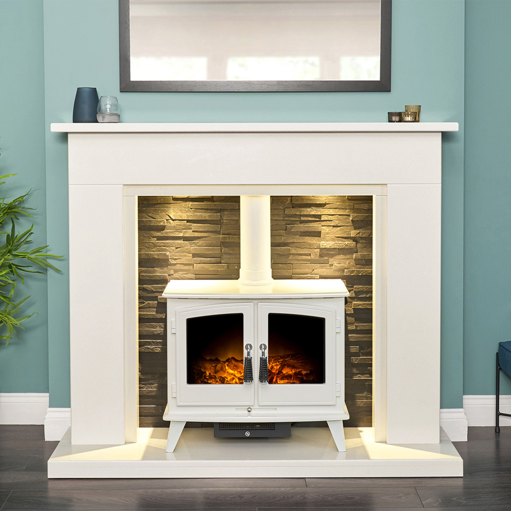 Acantha Miramar White Marble Fireplace with Downlight and Woodhouse Electric Stove 54 inch
