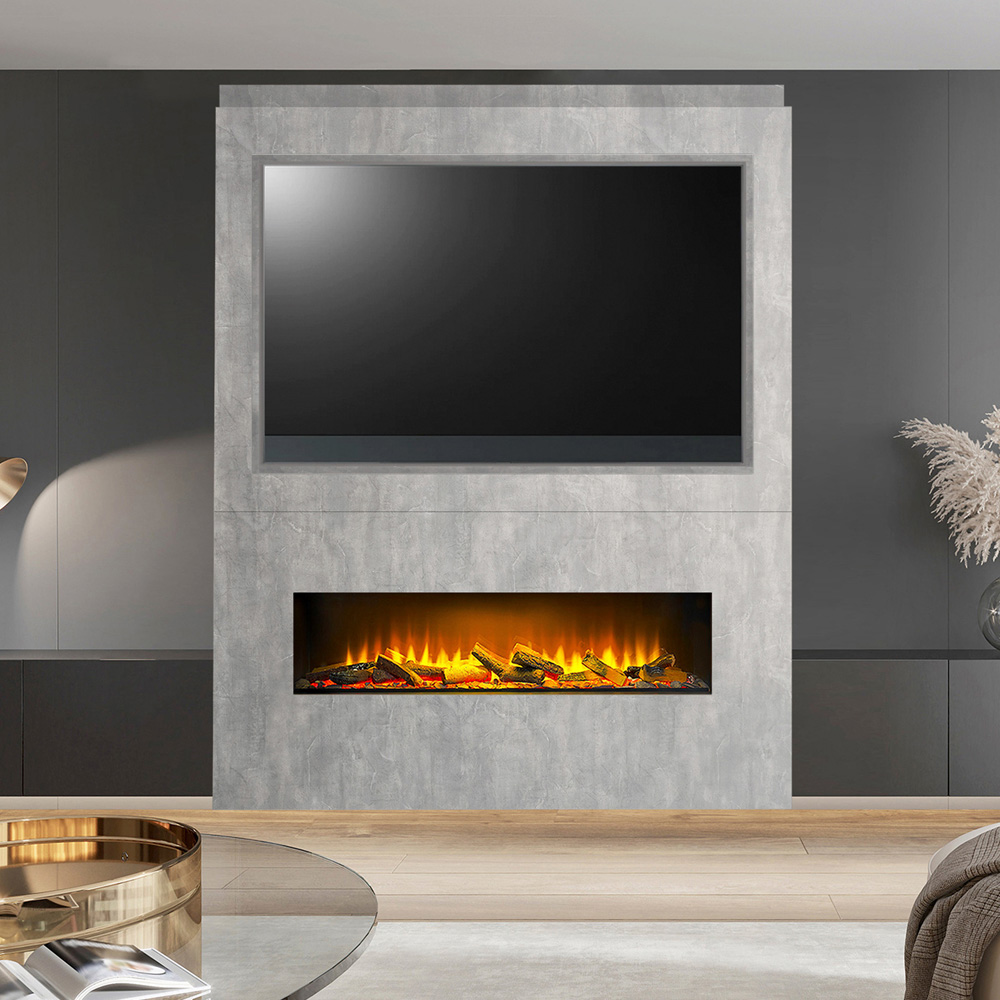 The Acantha Nexus pre-built fully inset media wall is supplied with an impressive concrete effect and has the added benefit of a TV recess which can accommodate wall-mounted TVs up to 65 inches, this media wall is designed with ease of installation in mind. Included is the atmospheric Acantha Aspire 125 which benefits from the premium log effect set with slate and crystal effect fuel bed, 3D LED flame effect technology and seven colour settings as well as a heat output of 1kW and 2kW. All of these can be operated by the supplied remote control on a seven-day programmable timer. Once installed it is guaranteed that this media wall will be a fantastic focal point of your room.