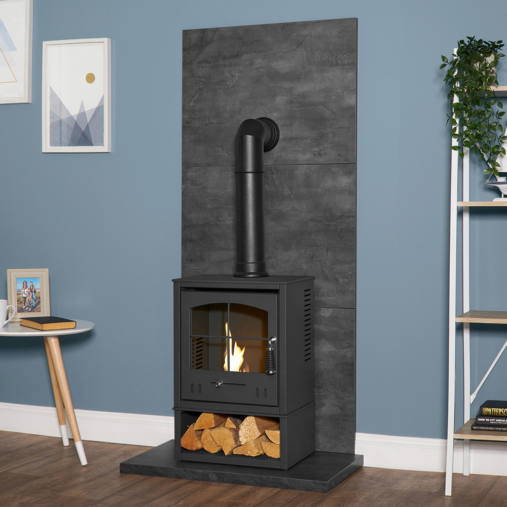 This set created by Acantha includes everything you need to create a modern focal point. Included is a set of three tiles and hearth, which are finished in a slate Venetian plaster effect, along with a charcoal grey bioethanol stove and tall angled stove pipe. The bioethanol stove offers the brilliance of a real, open flame and lets you benefit from the airflow convection system for up to eight hours thanks to the 1.5L stainless steel bio ethanol burner. The stove can provide a heat output of up to 3kW depending on the size of the opening, which can be safely adjusted by using the supplied control tool. The modern-looking stove is glass-fronted, and you can operate the door by turning the attached handle by 90 degrees.