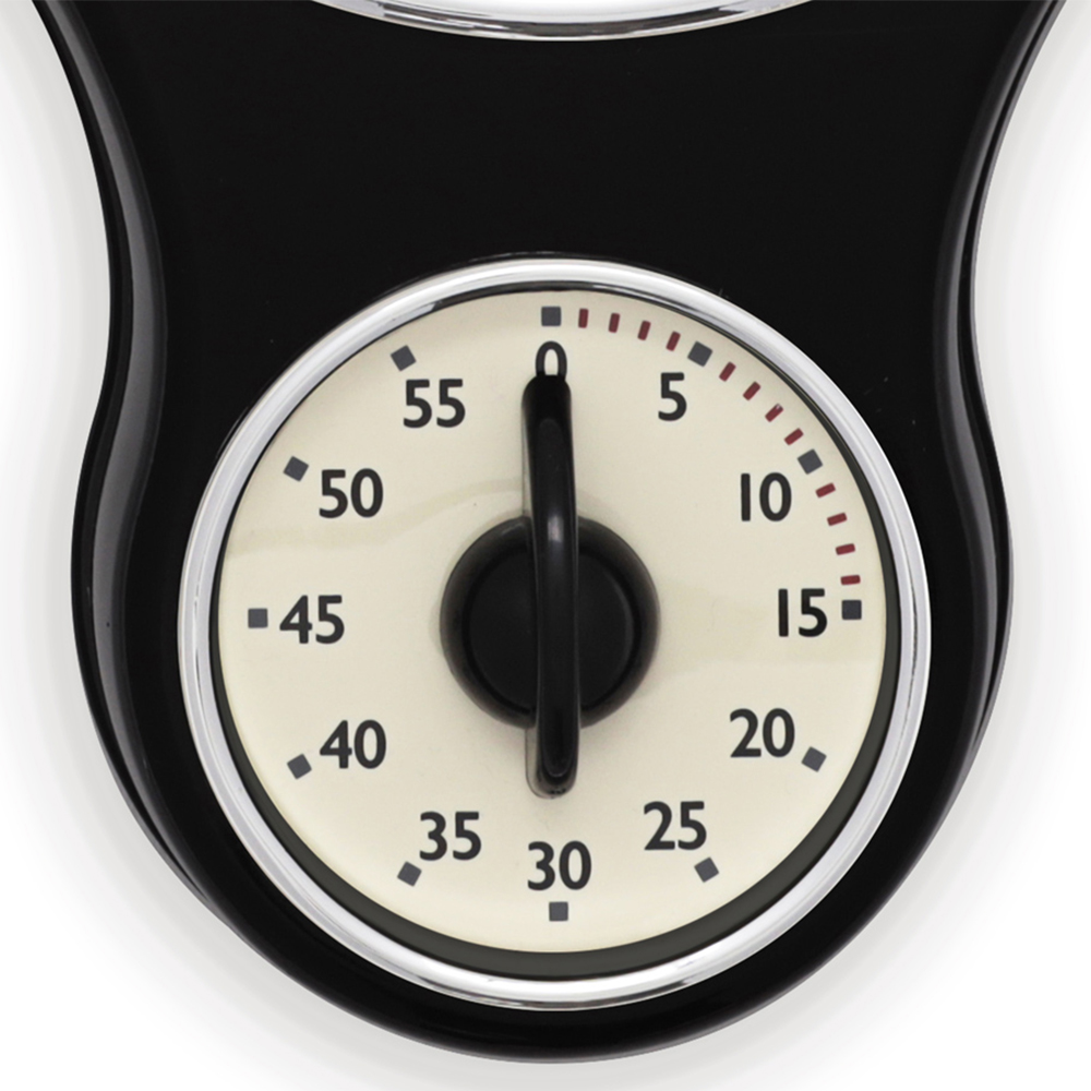 Make a beautiful addition to your home with the Acctim Kitchen Time Black Clock and Timer 30cm. This retro-style clock has a one-hour mechanical timer and can be used in any interior space. It features a black plastic case and a dial with quartz movement. It also has a domed glass lens for added safety. With its black numbers and hands, this clock can be a perfect choice to add to your home decor.