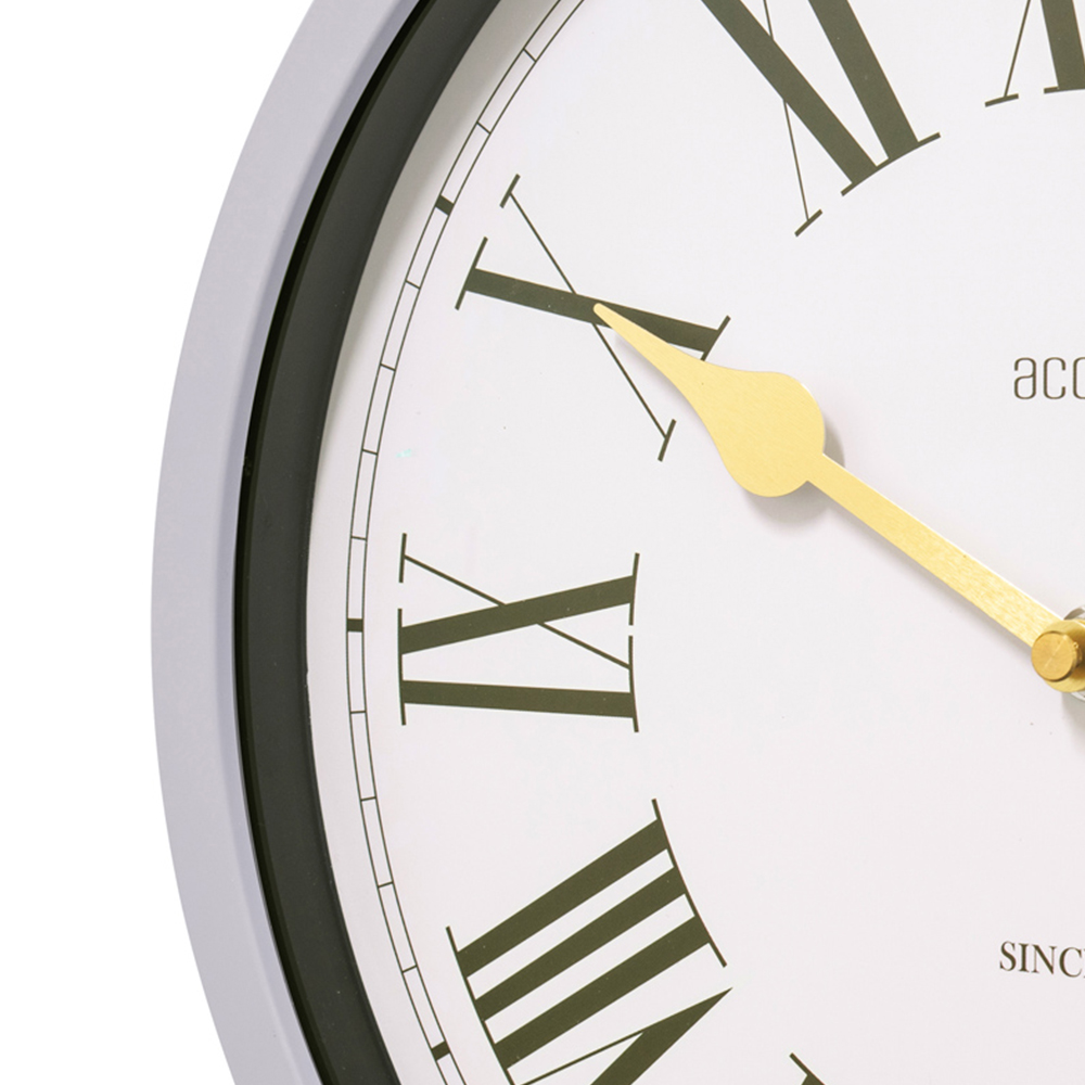 Upgrade your living space with the Acctim Turin Mist Outdoor Round Wall Clock 36cm. This clock perfectly combines a cool grey plastic case and an off-white dial with quartz movement. It features elegant gold spade hands for a classy look. This wall clock is also fully equipped for the outdoors with Acctim's weatherproof movement and glass lens, allowing you to place it anywhere in your garden. With its large Roman numerals and a train track minute marker dial, this clock can be a perfect choice to add to your home decor.