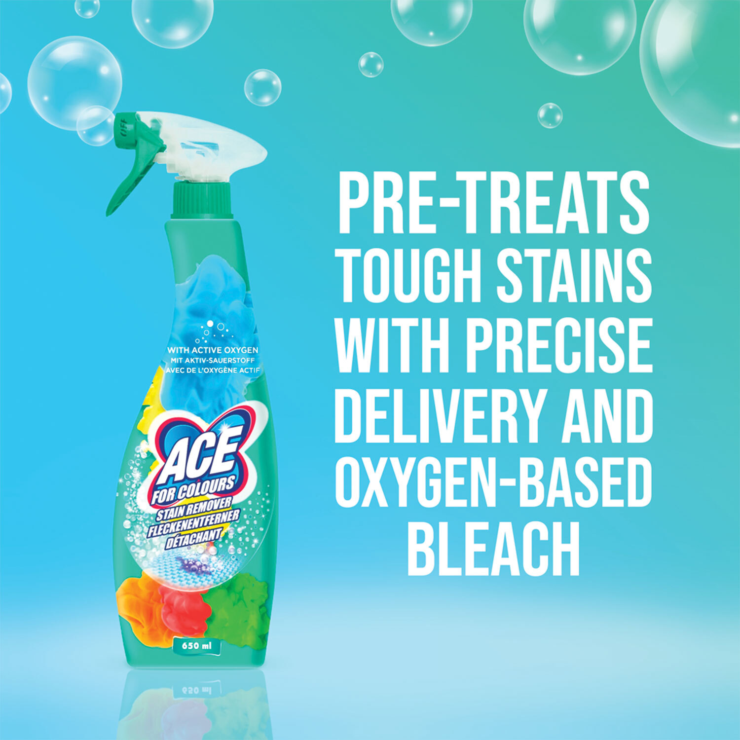 The perfect addition to any home, this Ace for Colours Stain Remover Spray helps to get stains and spots out of your fabrics. Spray directly on to the problem area for a quick and easy treatment. Formulated with bleach and surfactants, this is able to remove relevant consumer stains as bleachable and greasy.