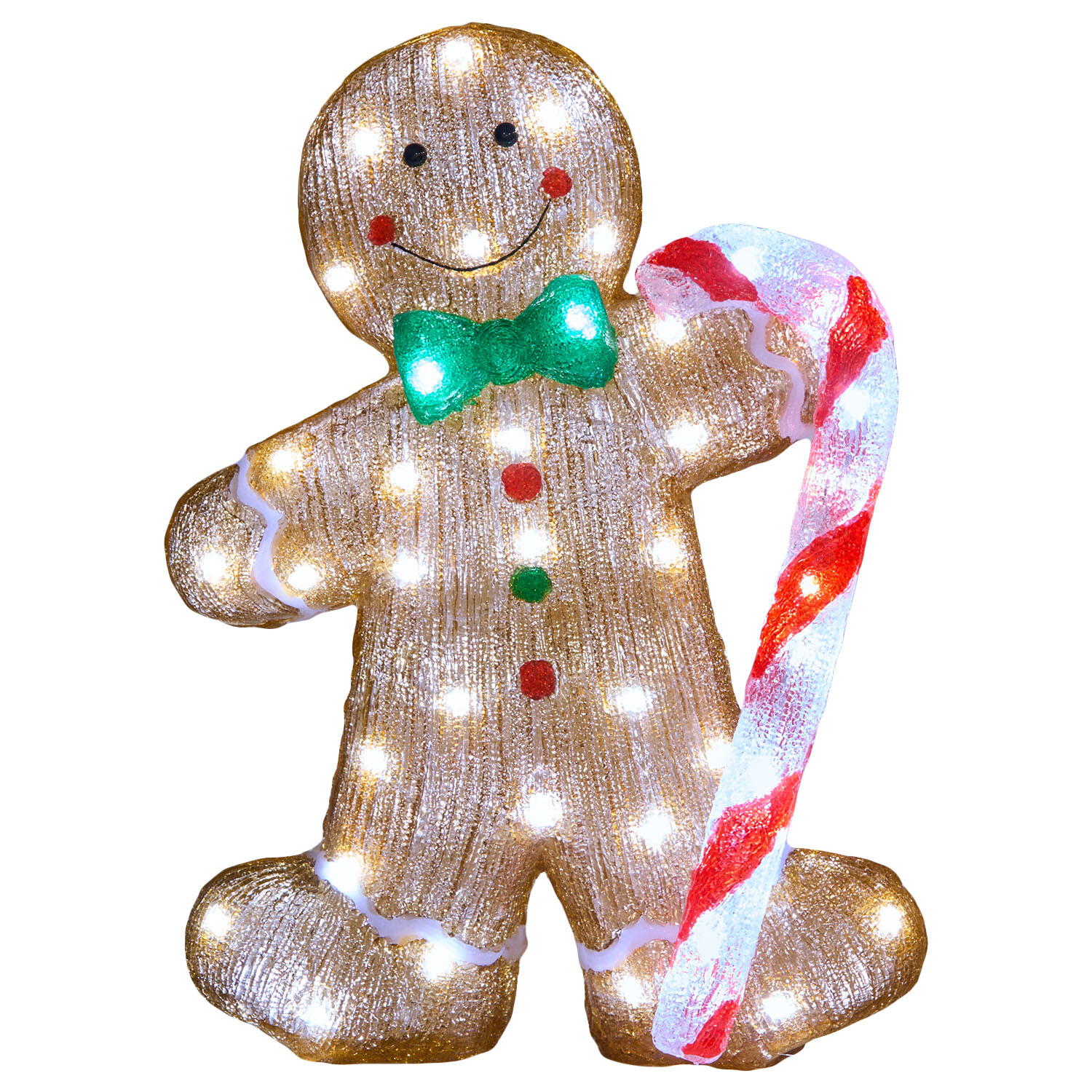Add a sweet touch to your festive decor with this Acrylic Candy Cane Gingerbread Decoration. Featuring an adorable gingerbread holding a candy cane, this decoration is a must-have to elevate your space. Equipped with LEDs, it casts a warm, inviting glow that'll impress all your visitors.
