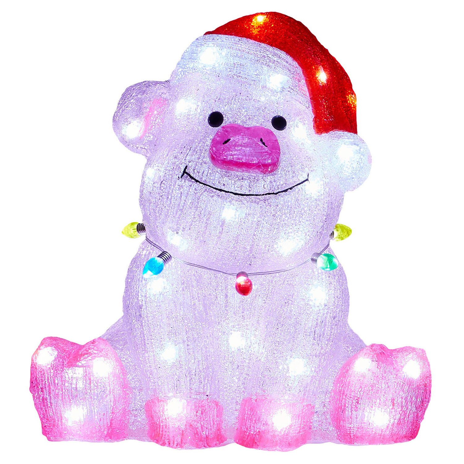 Get into the holiday spirit with the Acrylic LED Pig. This adorable sitting pig sculpture is perfect for adding a touch of charm to a child's bedroom or any festive space. With 60 cool white LEDs, this whimsical pig is designed for indoor use and will bring a heartwarming glow to your holiday decorations. Let this delightful pig illuminate your space and fill it with joy throughout the holiday season.