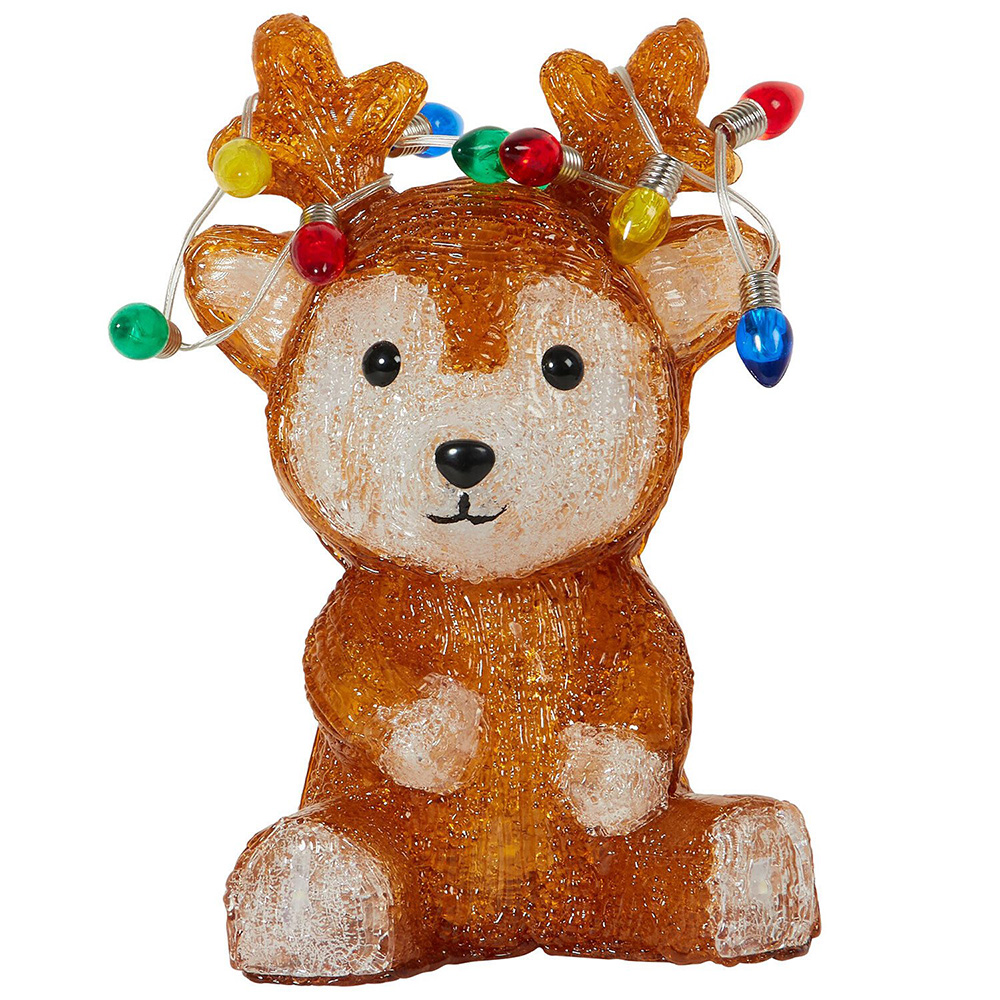Elevate your decorations with the Acrylic Reindeer. This cute animal enhances your festive decor. Made of acrylic, it features the intricate details of a reindeer, with LED lighting. The reindeer features colourful LED strings on its antlers, adding a festive touch. The 30 cool white LEDs require three AA-powered batteries that are not included in the product.