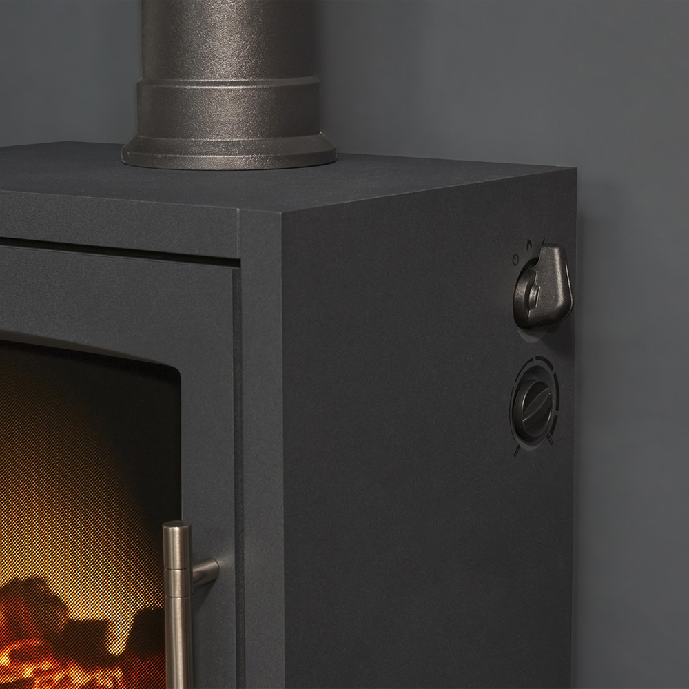 The Adam Bergen XL electric stove is a traditional stove with modern features. Supplied with a log storage area and angled stove pipe, this stove will be the focal point of any room. Featuring two heat settings of 0.9kW and 1.8kW which can be adjusted with the thermostat as well as a flame-only setting which allows you to use the Bergen XL all year round. The flame effect is created by the long-lasting LEDs which simmer behind the realistic log fuel bed.