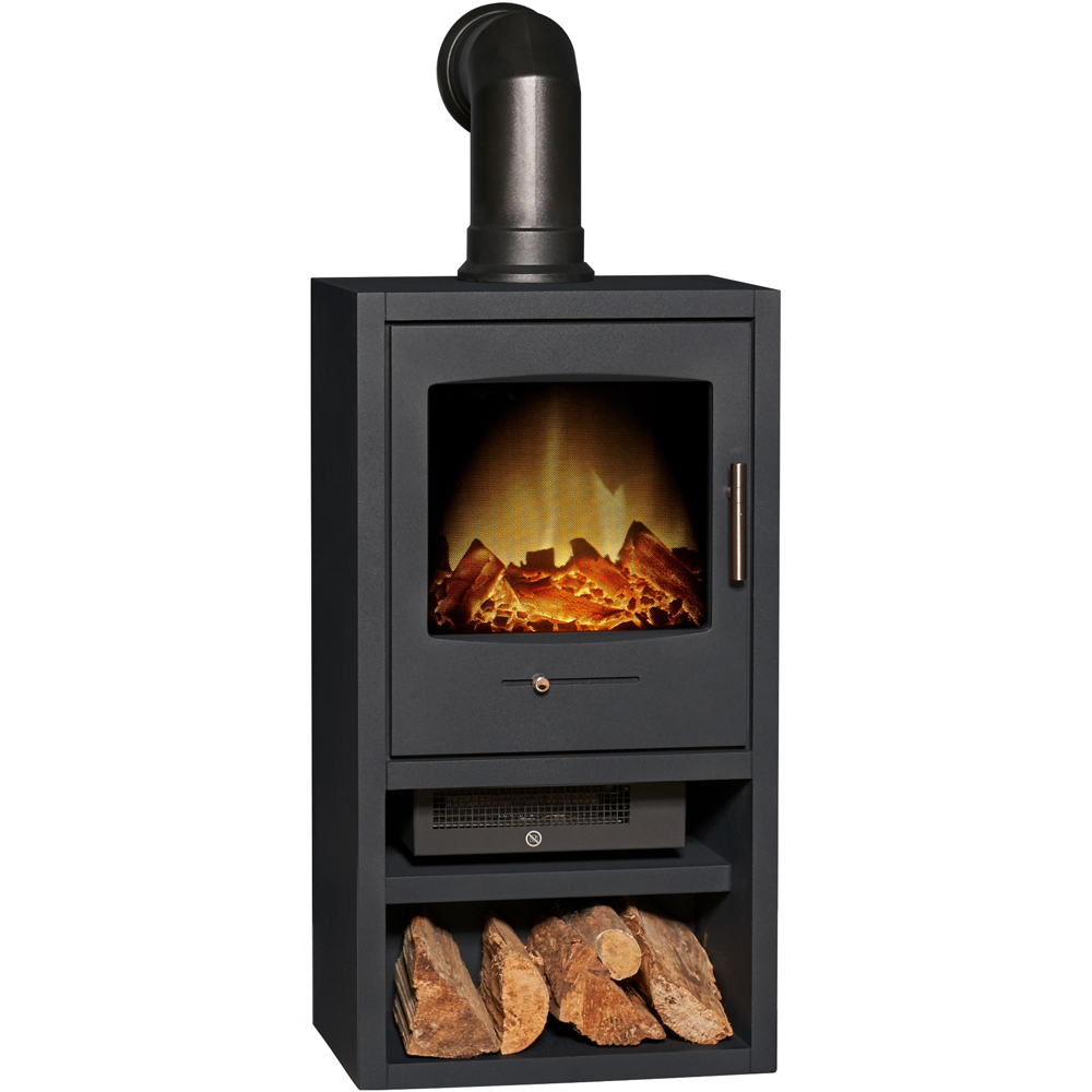 • Features a charcoal grey finish and includes log storage