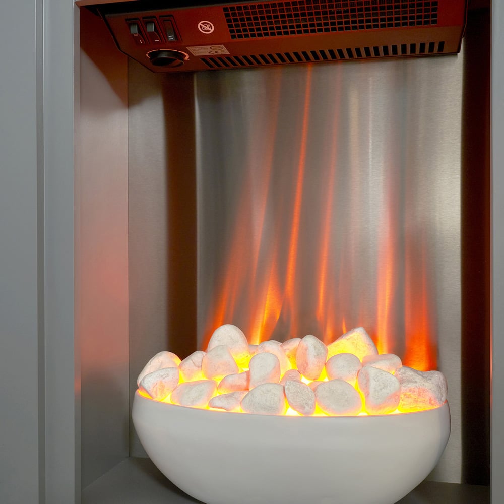 Our Adam Monet Fireplace Suite is eye-catching and stylish, the insert holds an electric fire that simmers gently in a bowl of white pebbles. The straight, grey lines of the surround have a decidedly minimalist allure, and combine with the pure white colour of the bowl and delicately glowing embers to lend your home an attractive, contemporary quality.