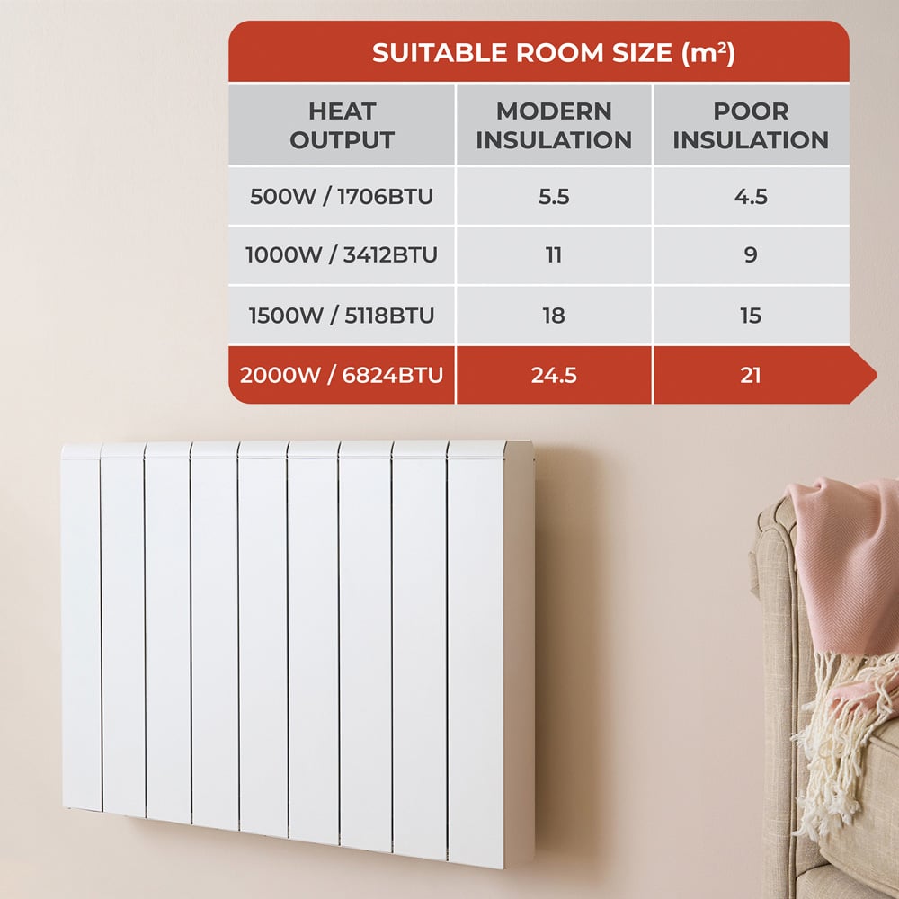 The sleek, stylish and space-saving LOT-20-compliant Adam Samson electric dual heating radiator is the perfect alternative to all traditional forms of heaters. Cleverly designed for instant heat with its 1500W ceramic core and 500W convector heating technology this radiator can produce a total 2000W / 6824BTU heat output. The Samson radiator can be easily wall-mounted taking up very little space with no moving parts or pipework required. Another fantastic feature is that you can take control of the radiator to suit your lifestyle with the Wi-Fi app which allows you to easily operate the thermostat and 7-day programmable timer. But if desired you can operate the radiator manually via the visually impressive LCD which also has a child lock feature for added security and peace of mind.