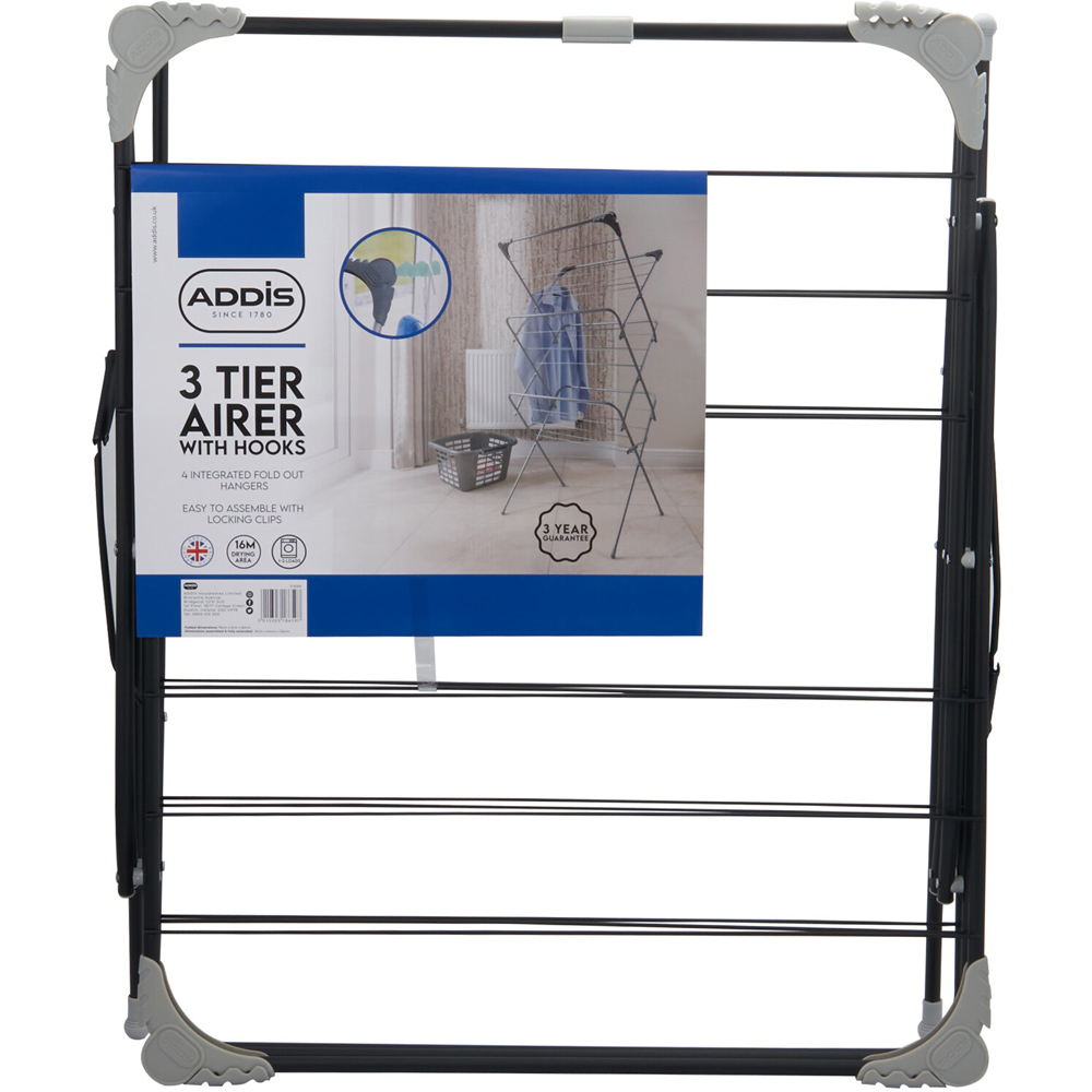 Dry your clothes in style with this Addis 3 Tier Airer. With 16 metres of drying space, this airer is a practical and contemporary addition to your space. Available in a trendy colourway, it's sure to look great in any home and help you easily dry your laundry indoors. It folds up for easy storage and has fold-out hooks so you can dry even more.