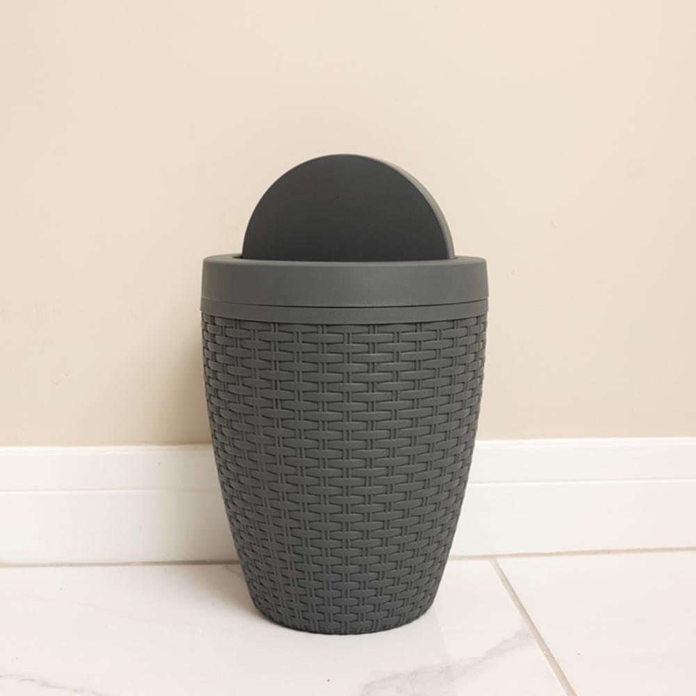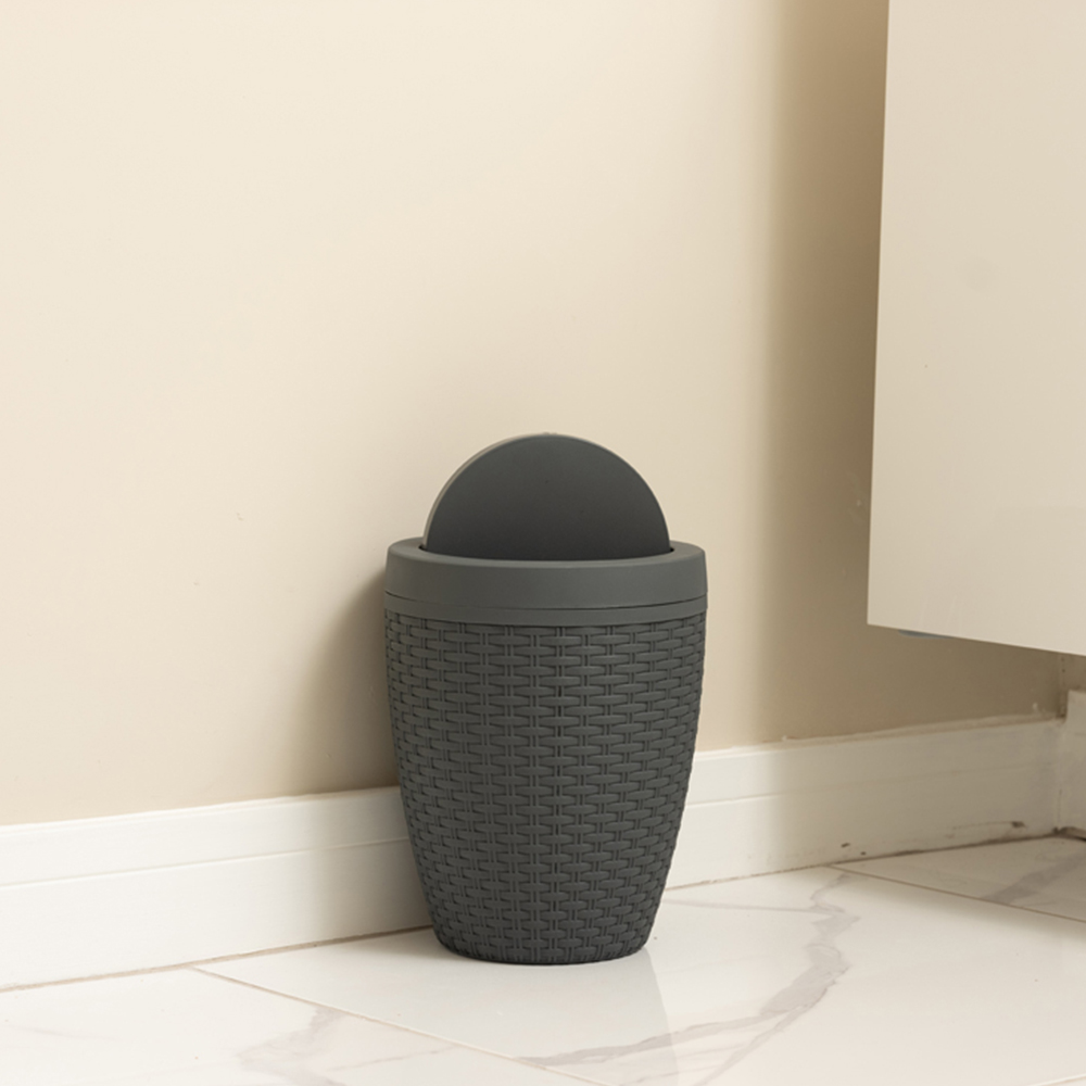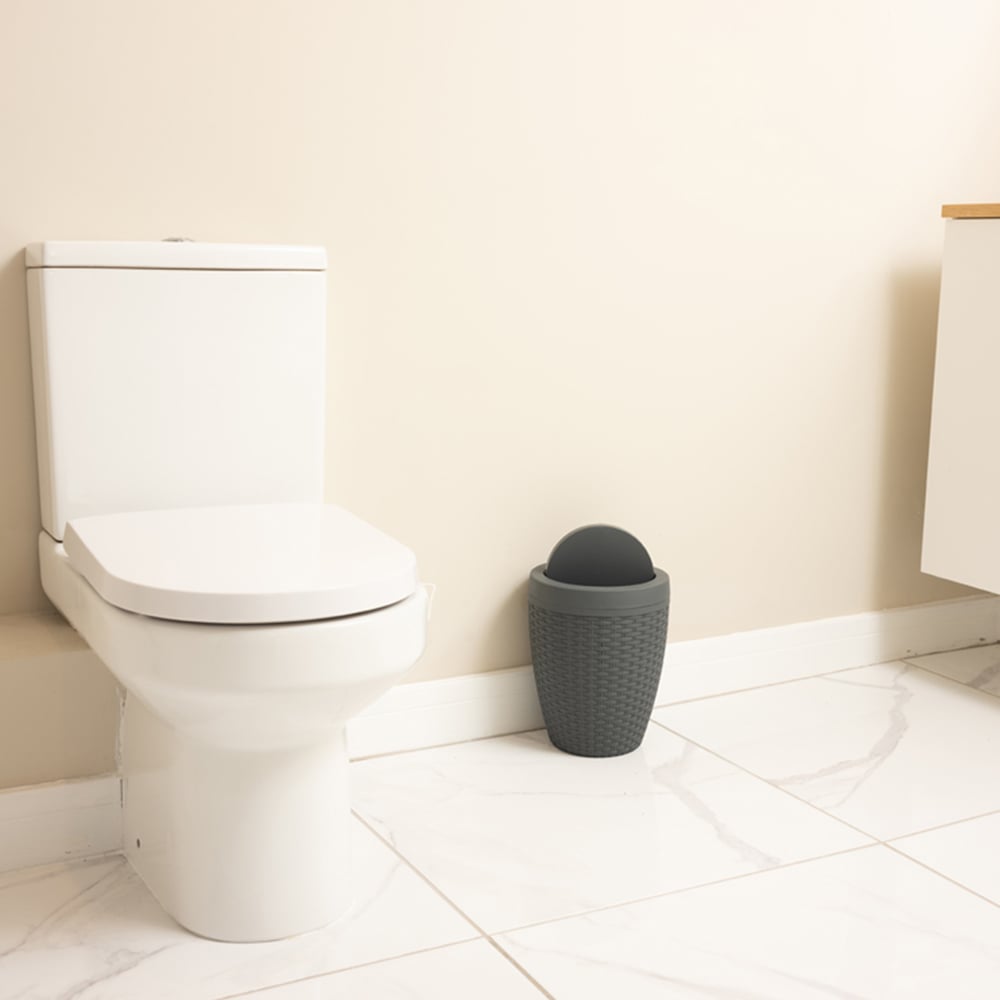 Keep your space tidy with the Addis Charcoal Faux Rattan Bath Bin. This faux rattan swing bin is a stylish addition to any bathroom. It includes an inner rim to conceal liners discreetly and make your space look stylish. It features a lightweight and spacious design with an easy-to-open swing lid.