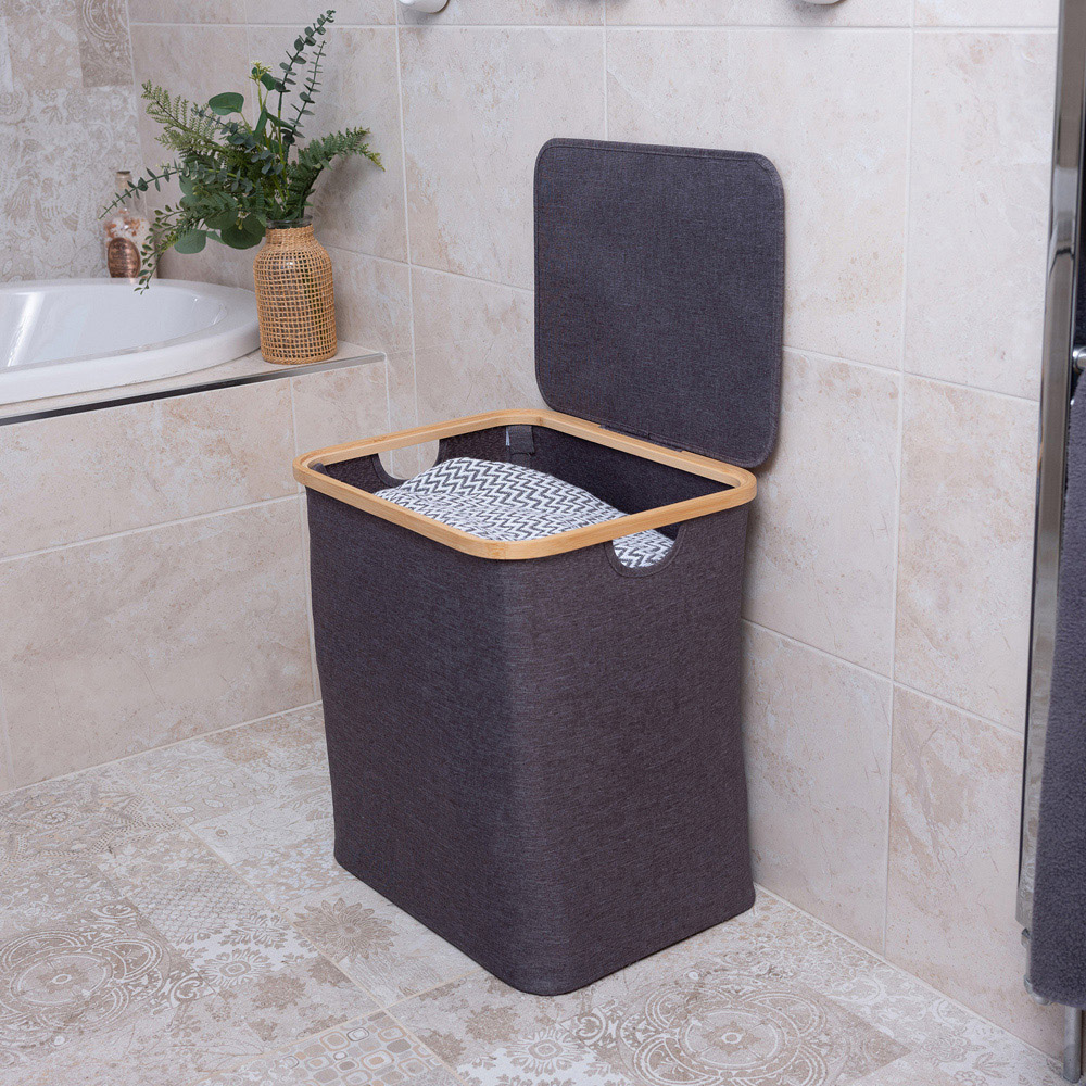 Keep your space tidy with the Addis Grey Bamboo Laundry Hamper 70L. It takes advantage of an ingenious design that folds almost completely flat when not in use. It is made from Oxford fabric and finished with a bamboo wood rim. The generous 70-litre capacity offers plenty of space for 2-3 loads of laundry, making it perfect for busy family homes. Unlike traditional laundry baskets, the ingenuity comes in its collapsible design. When you finally get through all the washing, you can fold it down for easy storage under your sink, on shelves or even on top of the washing machine.