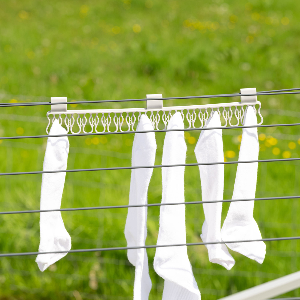 Experience hassle-free laundry days with the ADDiS Mail Order 3 Arm Rotary Airer 35m. It is perfect for everyday family use. It is easy to operate and has a strong design. It features umbrella clip lock mechanism with tension adjustment for heftier loads. Setting it up is simple, as it comes with a 32mm ground spike and requires basic assembly to connect the two-piece centre pole. This airer features an adjustable tension clip that supports heavier loads. Its three-arm design offers ample space for bedding and larger items as these arms span slightly wider. Crafted from rust-resistant, powder-coated steel, it provides a reliable solution for drying clothes outdoors. Equipped with an umbrella clip system and a line tidy strap, it is designed for easy use. Plus, it comes with a five-year guarantee.
