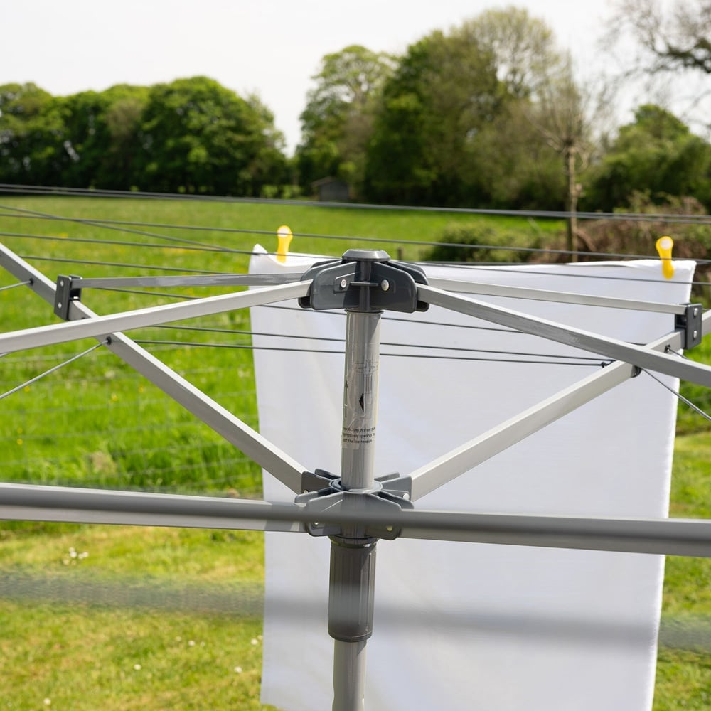 Experience hassle-free laundry days with the ADDiS Mail Order 4 Arm Rotary Airer 40m. It is perfect for everyday family use. It is easy to operate and has a strong design. When fully opened, it has a turn circle of 1.96 metres and can reach a maximum height of 1.75 metres. Setting it up is simple, as it comes with a metal 32mm ground spike and requires basic assembly to connect the two-piece centre pole. This airer features an adjustable tension clip that supports heavier loads. It also offers 40 metres of washing line which is enough space for two to three wash loads. Crafted from rust-resistant, powder-coated steel, it provides a reliable solution for drying clothes outdoors. Equipped with an umbrella clip system and a line tidy strap, it is designed for easy use. Plus, it comes with a five-year outdoor rotary guarantee.