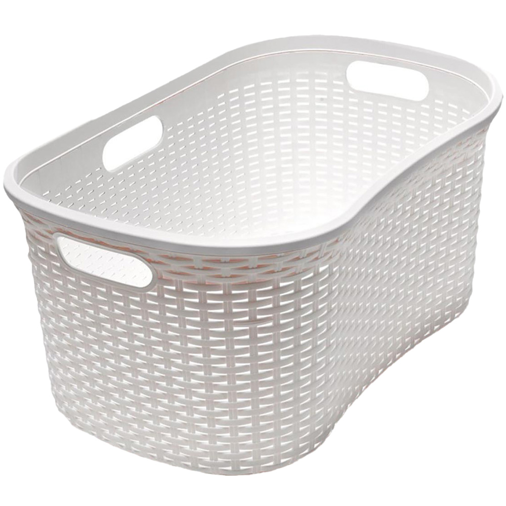 Stylish and contemporary, this Addis White Rattan Hipster Laundry Basket 40L is an asset to your utility room. In a faux rattan effect, this laundry basket is curved to sit on your hip; ideal for taking the load off transporting washing to and from the machine. The capacity of 40 litres makes this an ideal choice for larger families, and the three handles allow the basket to be easily moved around the home.