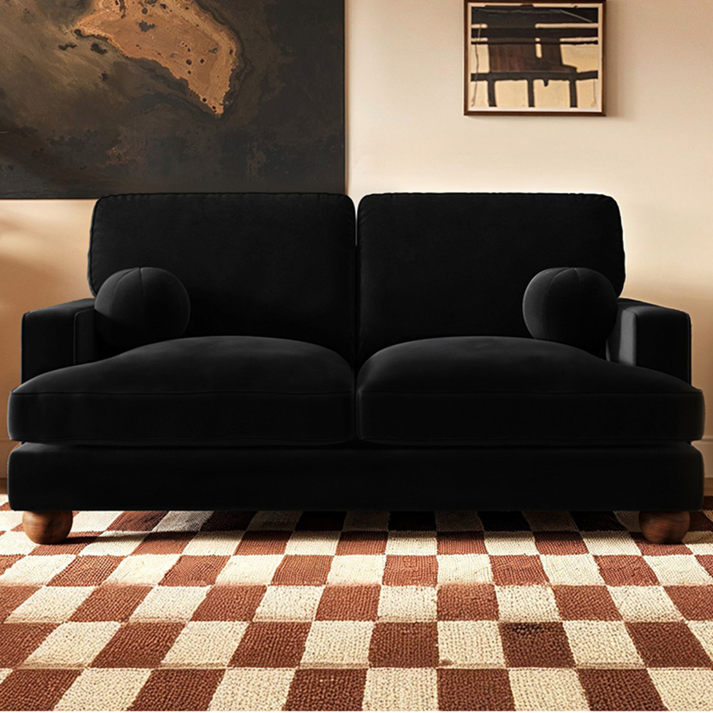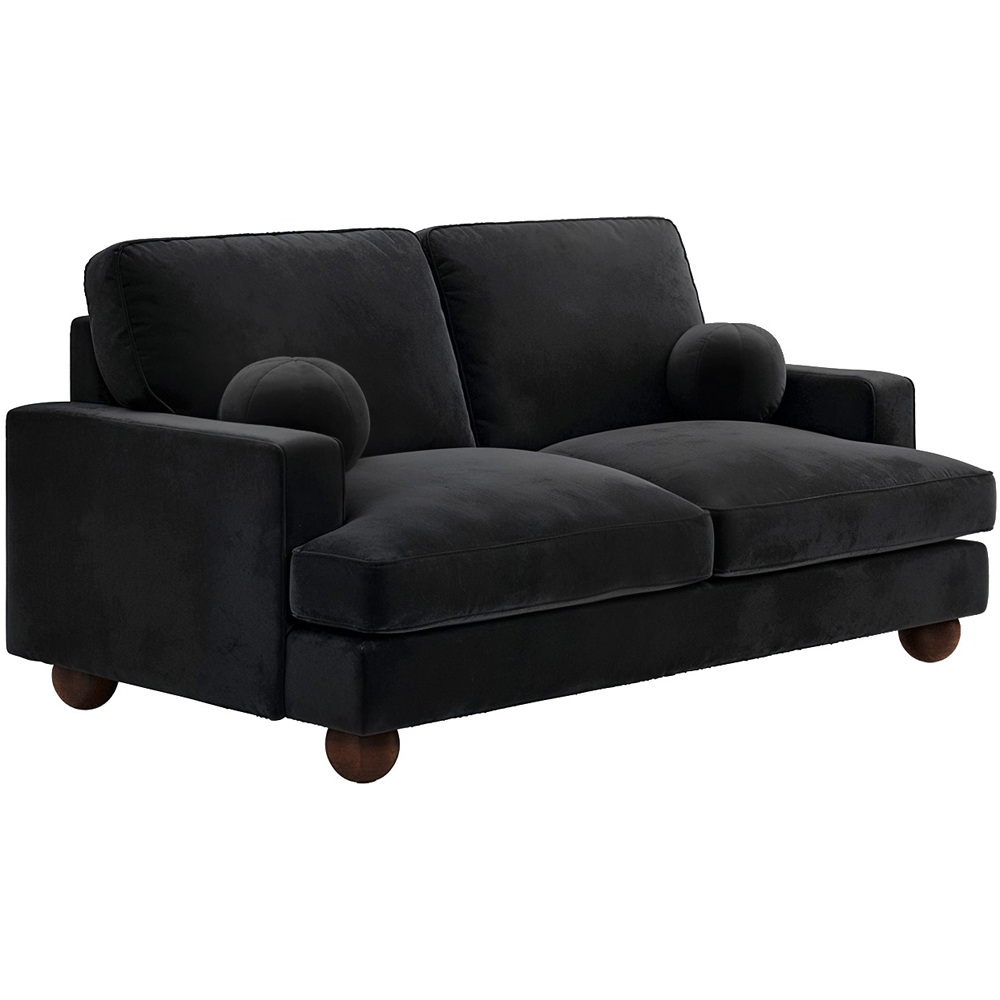 Experience the perfect blend of luxury and comfort with Solace+Co Addison 2 Seater Black Velvet Sofa. It seamlessly combines classic elegance with a modern twist, making it the perfect statement piece for any living space. Upholstered in luxurious black velvet, it exudes sophistication and timeless appeal, while the bold statement ball feet add a contemporary edge to its design. This beautiful sofa is not just about style—it’s designed with comfort and practicality in mind. The generously proportioned seat and back cushions are foam-filled for long-lasting support, and the scatter ball cushions are included to add an extra layer of plushness. The removable cushion covers allow for easy cleaning and maintenance, ensuring your sofa always looks its best. Built with a solid wood frame, it offers a robust and durable foundation, ensuring it stands the test of time. It is easy to assemble, you simply have to attach the statement ball feet and you’ll have your living room transformed in no time.