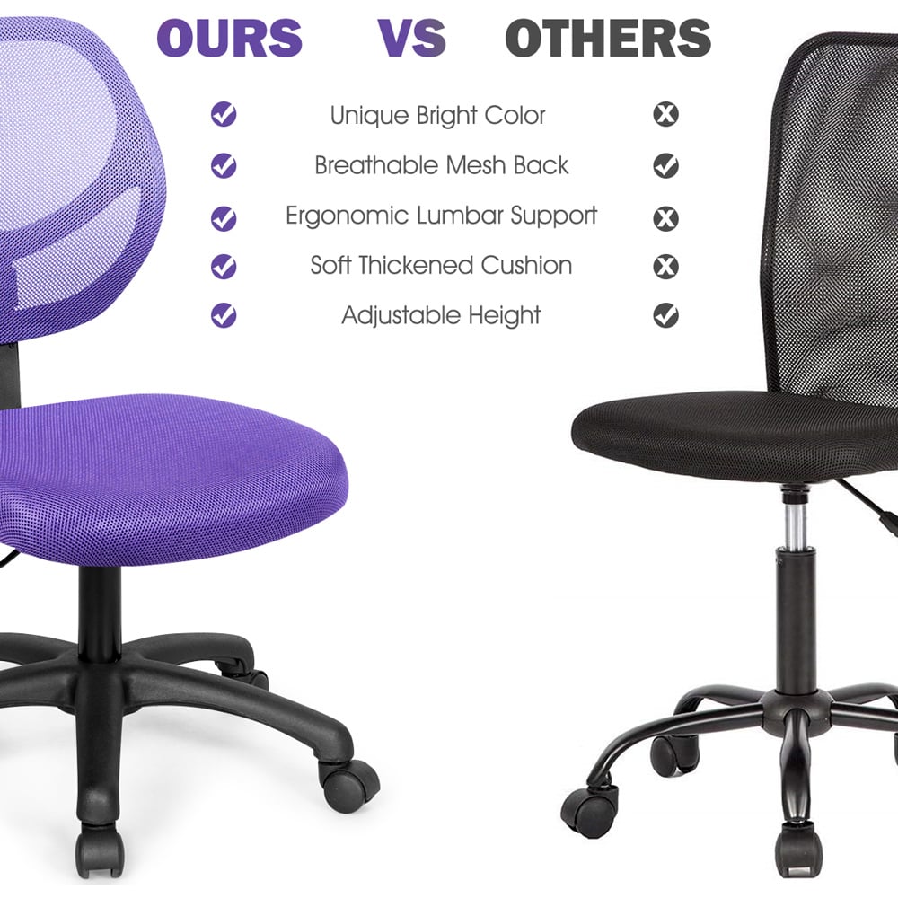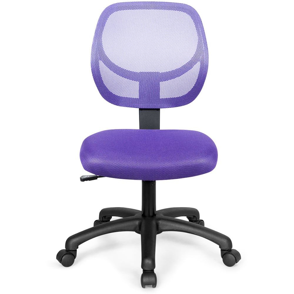 Upgrade your child's study setup with this Costway Purple Kids Adjustable Swivel Office Chair. Featuring a high-density sponge-filled seat and a breathable mesh low back, it keeps kids cool by allowing air to circulate as they sit. The chair's adjustable height, ranging from 43-52cm, ensures it can grow alongside your child, with the safe air-lift handle making it easy to find the perfect position for various desks and sitting preferences. Equipped with 360-degree caster wheels, the chair glides smoothly across floors and carpets, providing flexibility for study, bedroom, or playroom use. Its ergonomic design aligns with the spine's natural curve, helping reduce back pressure while offering lasting comfort. Built with a heavy-duty five-claw base, it provides stability. Assembly is straightforward with included instructions, making it a fun project to build together.
