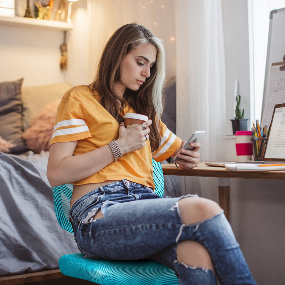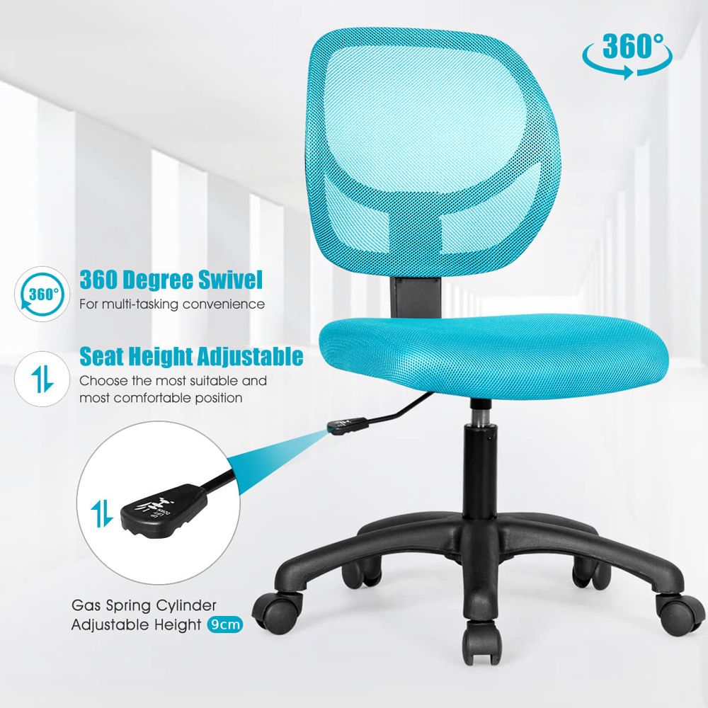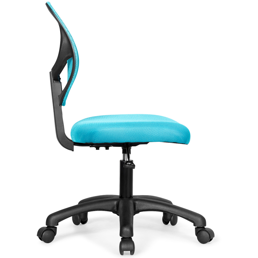 Upgrade your child's study setup with this Costway Turquoise Kids Adjustable Swivel Office Chair. Featuring a high-density sponge-filled seat and a breathable mesh low back, it keeps kids cool by allowing air to circulate as they sit. The chair's adjustable height, ranging from 43-52cm, ensures it can grow alongside your child, with the safe air-lift handle making it easy to find the perfect position for various desks and sitting preferences. Equipped with 360-degree caster wheels, the chair glides smoothly across floors and carpets, providing flexibility for study, bedroom, or playroom use. Its ergonomic design aligns with the spine's natural curve, helping reduce back pressure while offering lasting comfort. Built with a heavy-duty five-claw base, it provides stability. Assembly is straightforward with included instructions, making it a fun project to build together.
