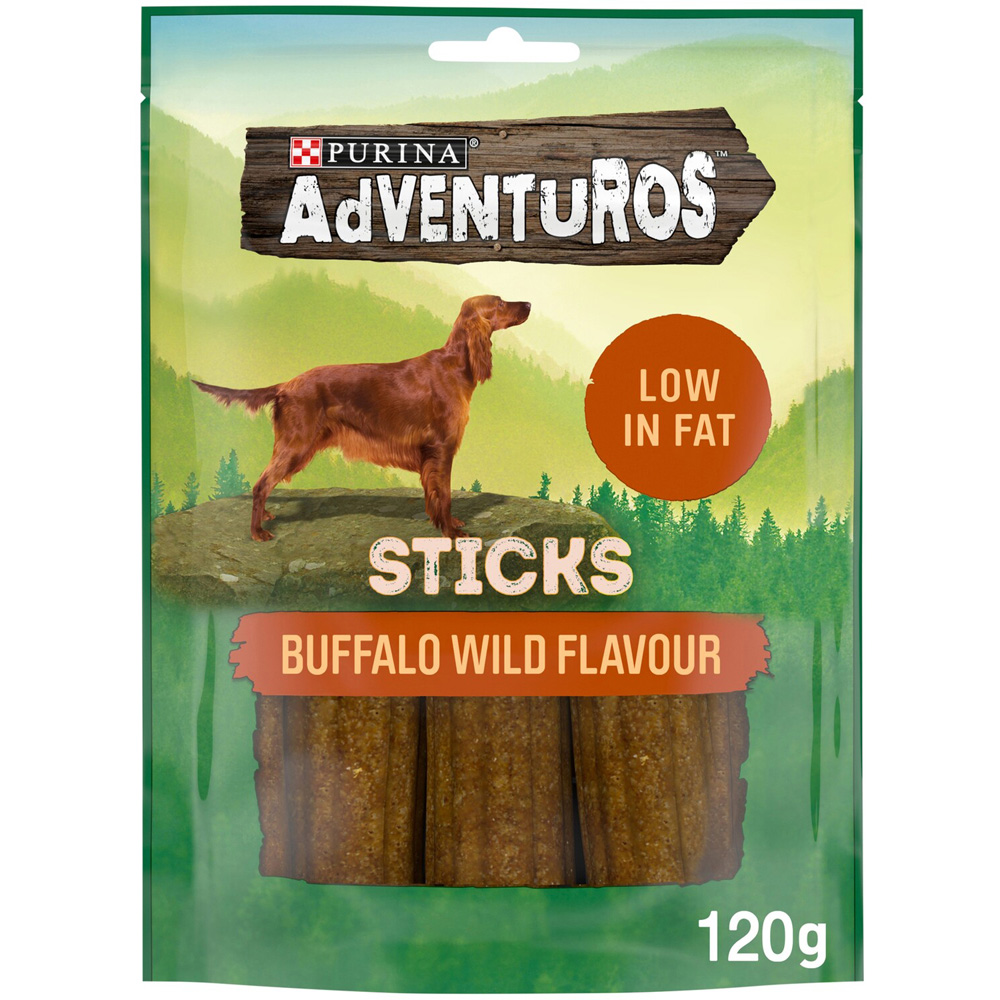 Treat your pup to an irresistible snack with Purina Adventuros Buffalo Flavour Sticks Adult Dog Treat 120g. These delightful chews feature a crunchy exterior and a soft, savoury filling that your dog won't be able to resist. They are conveniently packaged in a resealable bag and stay fresh longer, making them ideal for rewarding your furry friend for their good behaviour. Disclaimer: Feed as a treat or reward as part of a balanced diet. Dogs should be supervised at all times whilst feeding and always provide plenty of fresh water for your pet. Treats should always be given on a non-stainable surface as some products may stain.