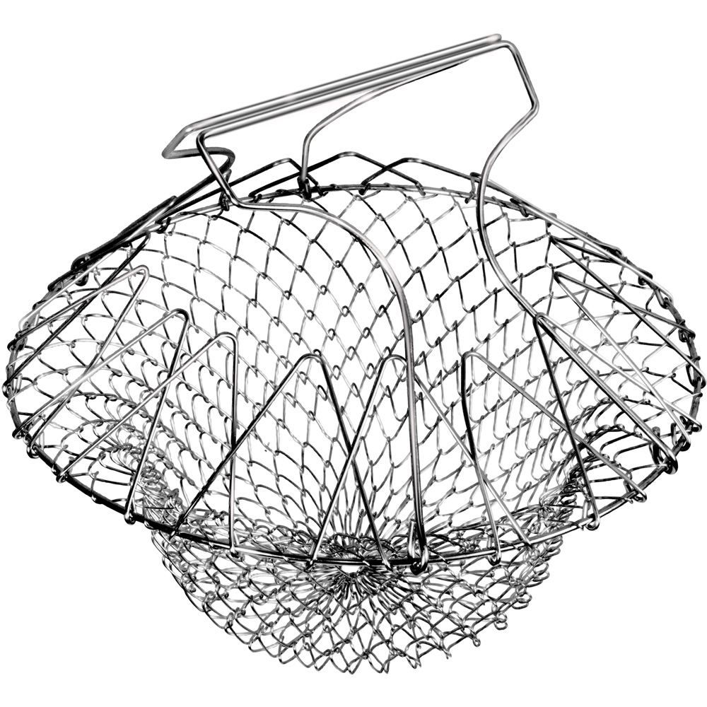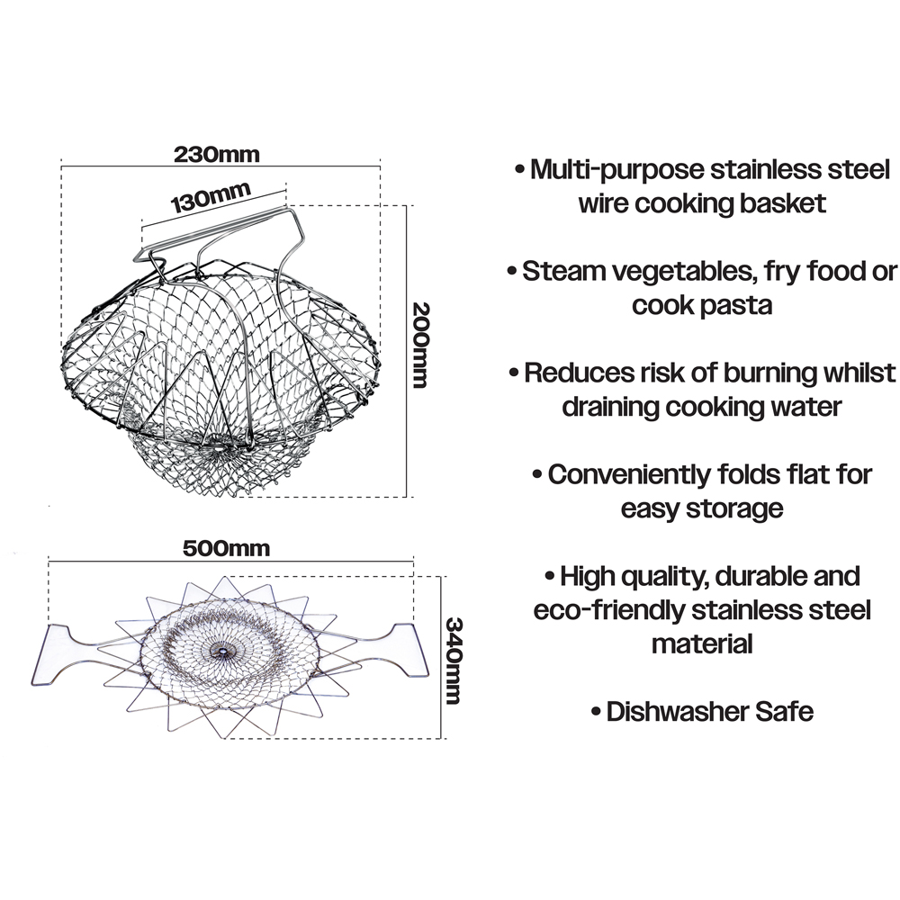 Enjoy fuss-free meal prep with this multi-purpose stainless steel cooking basket that folds flat for storage and makes draining, straining or steaming vegetables and other foods simple and safe, especially for those who want to avoid lifting heavy pans. Crafted from eco-friendly stainless steel, it’s ideal for cooking, cleaning or storing fruit and veg, and you can pop it in the dishwasher when you’re done so you’ll save time and effort in the kitchen.
